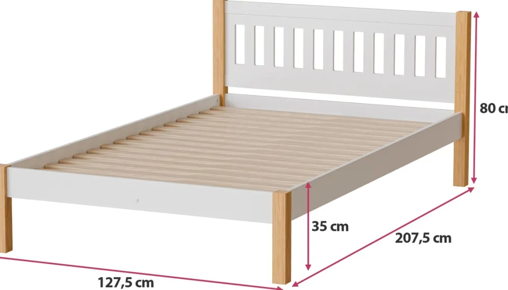 - Łóżko zostało wyposażone w stelaż listewkowy z miejscem na materac o powierzchni 120×200 cm. W zestawie z łóżkiem nie znajduje się materac.