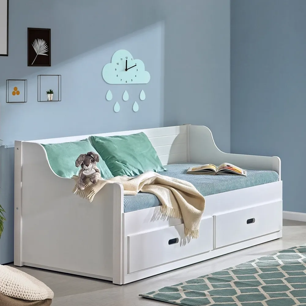 Ale to nie koniec udogodnień! Wielofunkcyjność drewnianego łóżka dla dzieci podkreśla obecność przemyślnie zaprojektowanych szuflad na pościel. Przestronne i łatwe w obsłudze, pomogą utrzymać porządek w pokoju dziecięcym, skrywając wszystko, czego potrzebujesz na wyciągnięcie ręki.