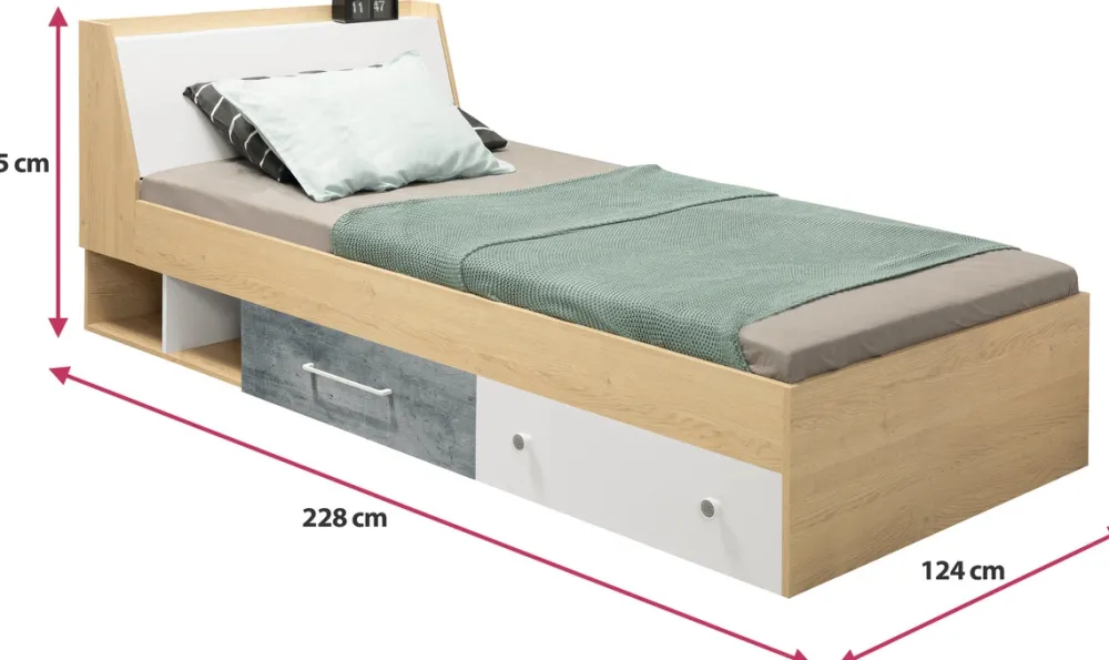 Mając na uwadzę to, że łóżko będzie użytkowane praktycznie codziennie, zwróciliśmy szczególną uwagę na jego wytrzymałość. Dlatego przy jego produkcji zastosowano wysokiej jakości płytę laminowaną, a krawędzie wzmocniono okleiną ABS, która dodatkowo zabezpieczy nasze łóżko przed ewentualnymi uszkodzeniami. W łóżku zastosowano płytę meblową, która spełnia funkcjonalność zwykłego stelaża i możemy śmiało umieścić na niej nasz nowiutki materac. Łóżko zostało również wyposażone w dwie otwarte wnęki oraz dwie obszerne szuflady, co stanowi idealne miejsce na zmieszczenie naszych pościeli, poduch, czy innych przedmiotów. Dodatkowo łóżko zostało wyposażone jeszcze w pojemnik znajdujący się wezgłowiu, co daje nam jeszcze więcej wolnego miejsca na upchnięcie naszych rzeczy.