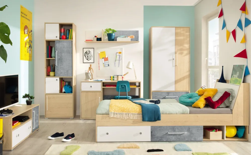 Nowoczesny styl jest wyrażany na wiele sposobów, lecz jego najważniejszym elementem są przede wszystkim barwy. Łóżko SLEEK zyskuje na młodzieżowym wyglądzie właśnie dzięki nim. Większość korpusu jest pokryte wybarwieniem w kolorze dąb biszkoptowy, natomiast wezgłowie cechuje wybarwienie biały lux. Fronty szuflad znajdujących się pod łóżkiem występują w dwóch różnych od siebie, ale idealnie współgrających kolorach: biały lux oraz beton. Takie połączenie kolorów gwarantuje przytulny i motywujący klimat w pokoju naszego dziecka, co na pewno pozytywnie wpływa na nastrój panujący w domowym zaciszu.