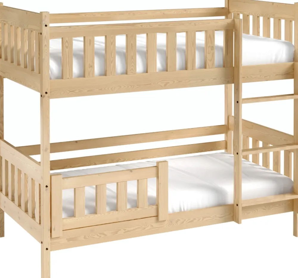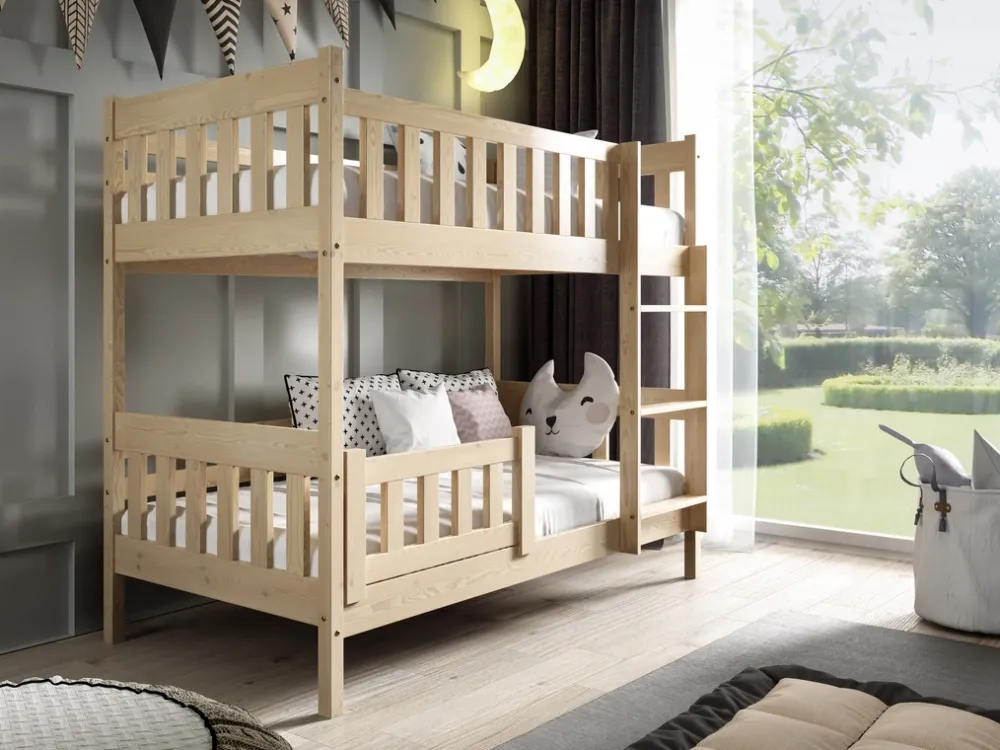 - Łóżko piętrowe z barierką LUMISLE idealne do pokoju dziecięcego. Wykonane zostało z drewna sosnowego w naturalnym wybarwieniu sosny. Posiada powierzchnie spania o wymiarach 80×190 cm. Możliwy montaż lewostronny lub prawostronny.