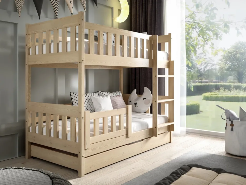 - Łóżko piętrowe z barierką LUMISLE idealne do pokoju dziecięcego. Wykonane zostało z drewna sosnowego w naturalnym wybarwieniu sosny. Posiada powierzchnie spania o wymiarach 80×190 cm. Możliwy montaż lewostronny lub prawostronny.