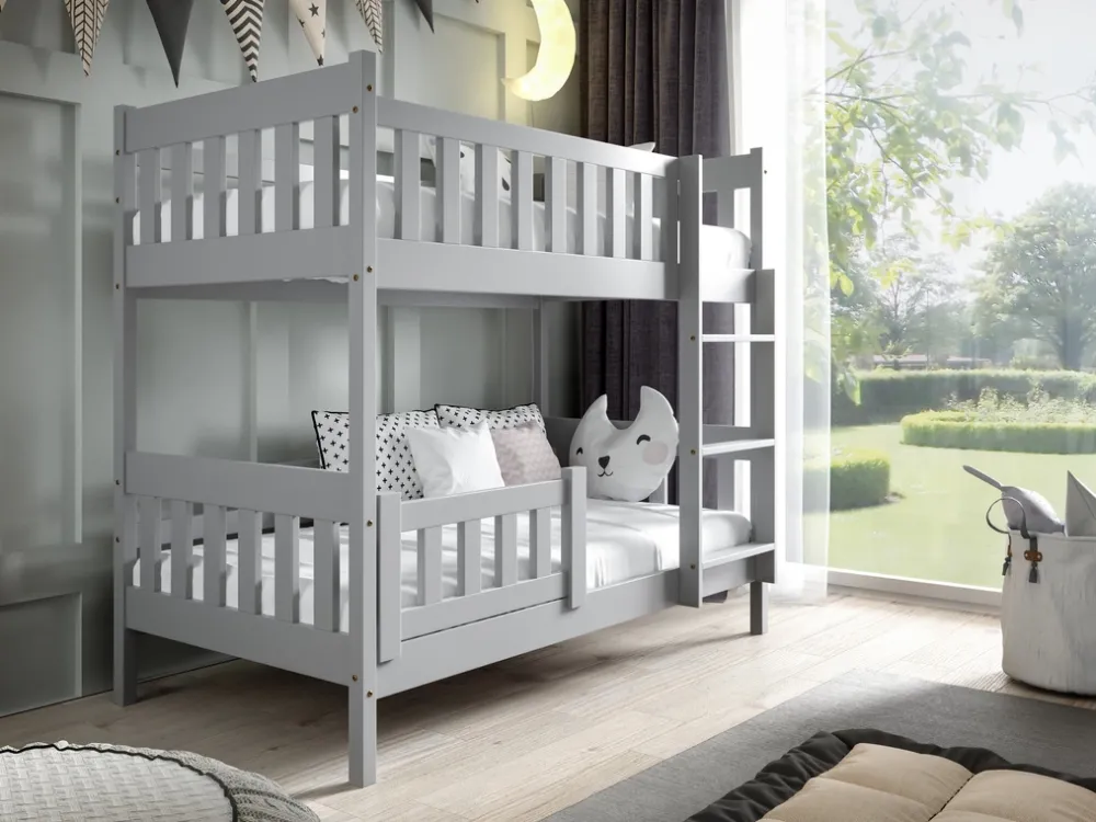 - Łóżko piętrowe w styla skandynawskim LUMISLE idealne do pokoju dziecięcego. Wykonane z drewna sosnowego w szarym wybarwieniu. Wyposażone zostało w drabinkę, barierki ochronne oraz stelaż rolowany na taśmie. Możliwość dokupienia pojemnej szuflady.