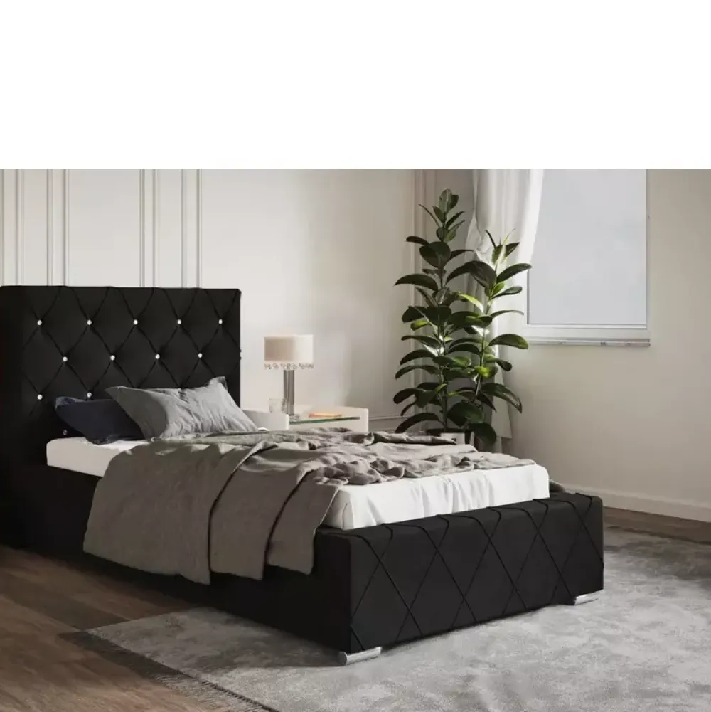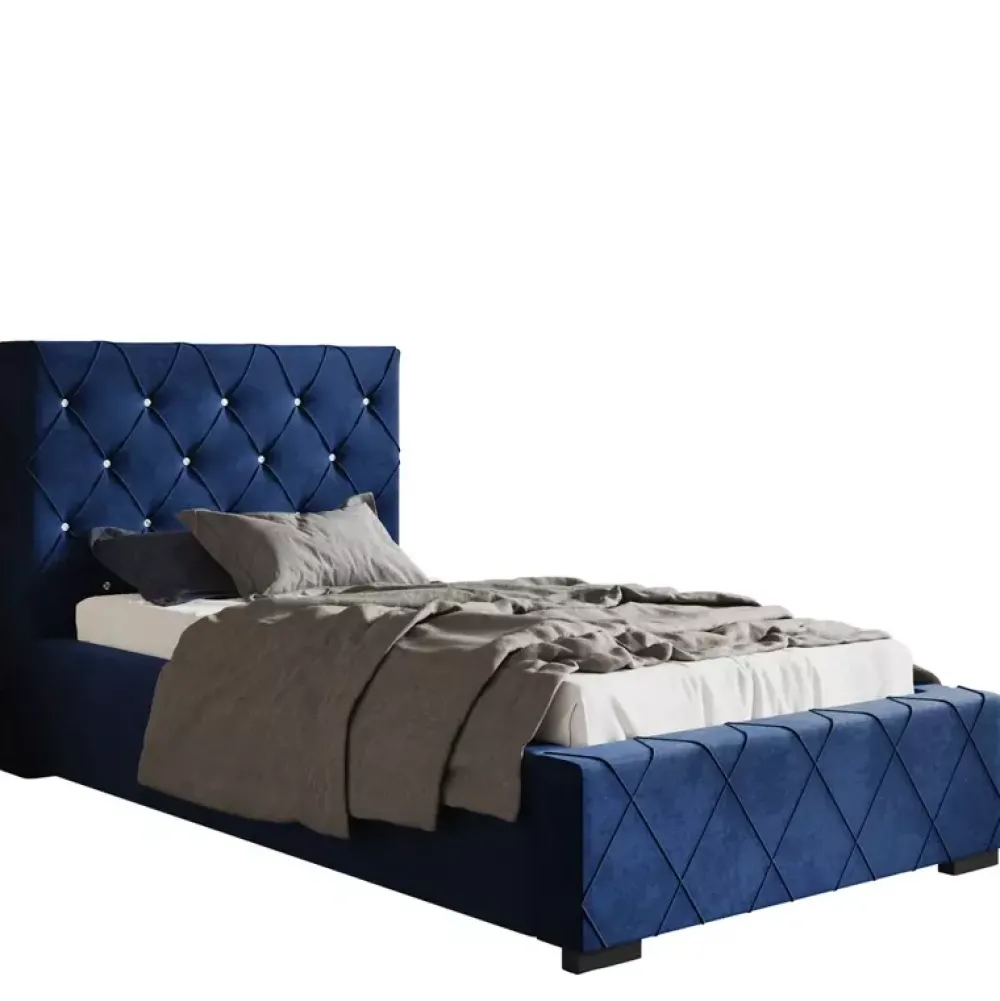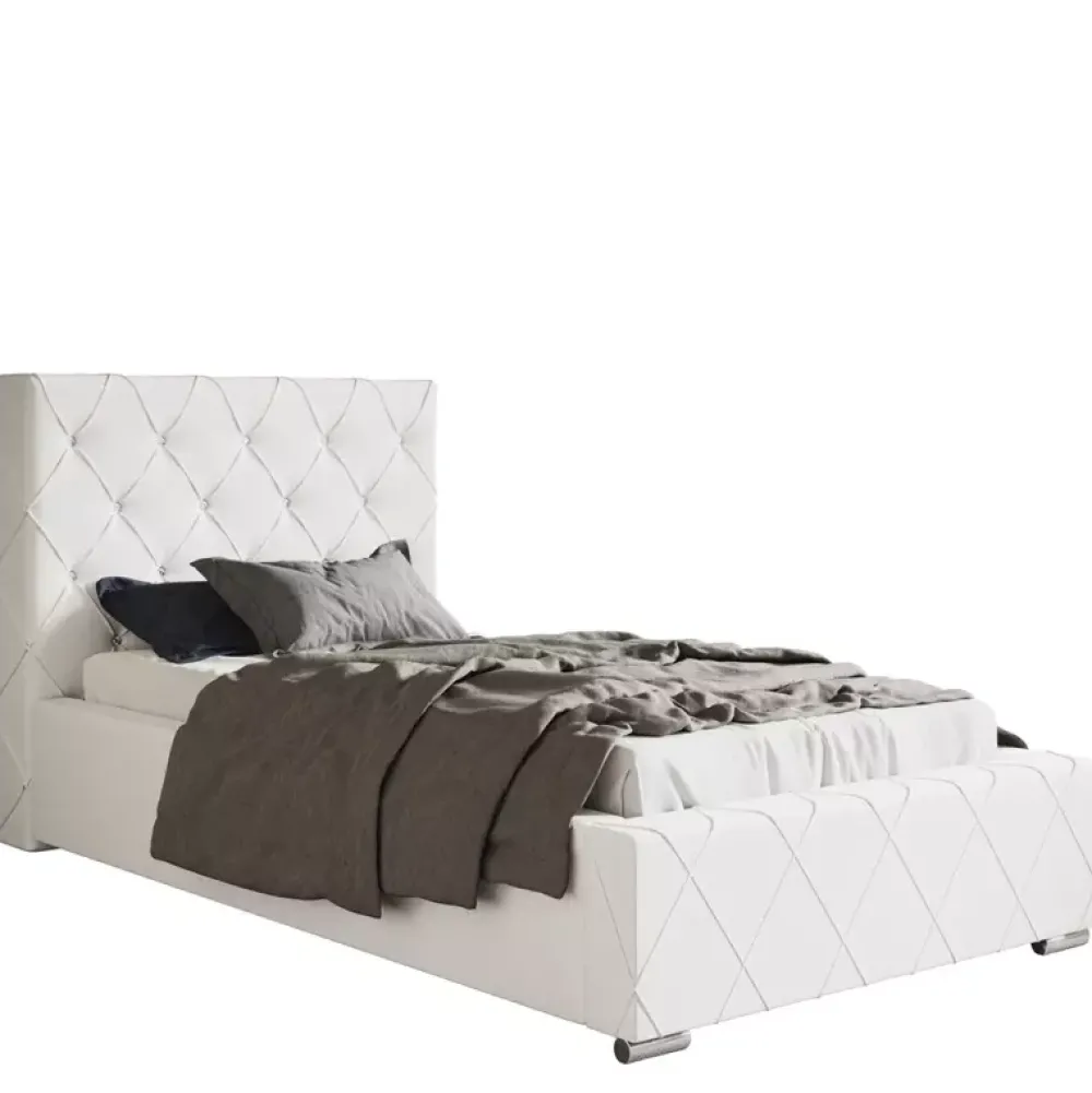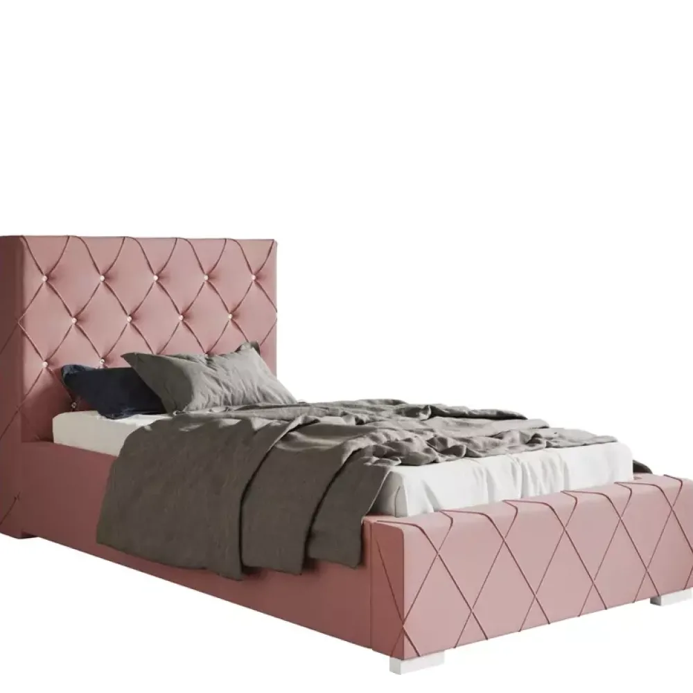 - Stylowe łóżko tapicerowane 90×200 cm z miękkim oparciem wykończonym w subtelny wzór caro z eleganckimi zakładkami. Wysokość zagłówka, rodzaj stelaża, kolor obicia tkanina można wybrać spośród opcji dostępnych w naszym konfiguratorze „Dopasuj i kup”.