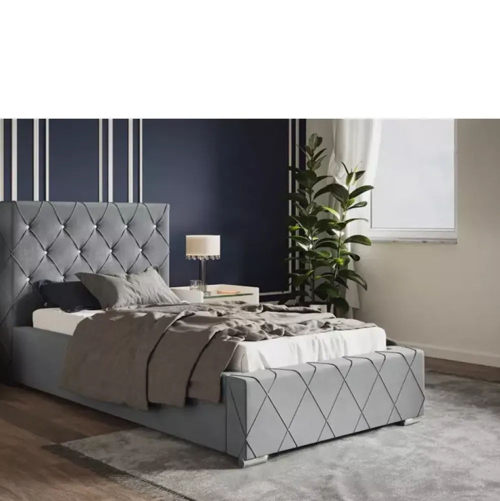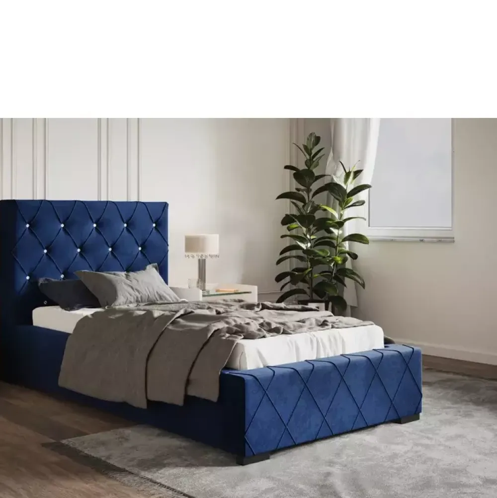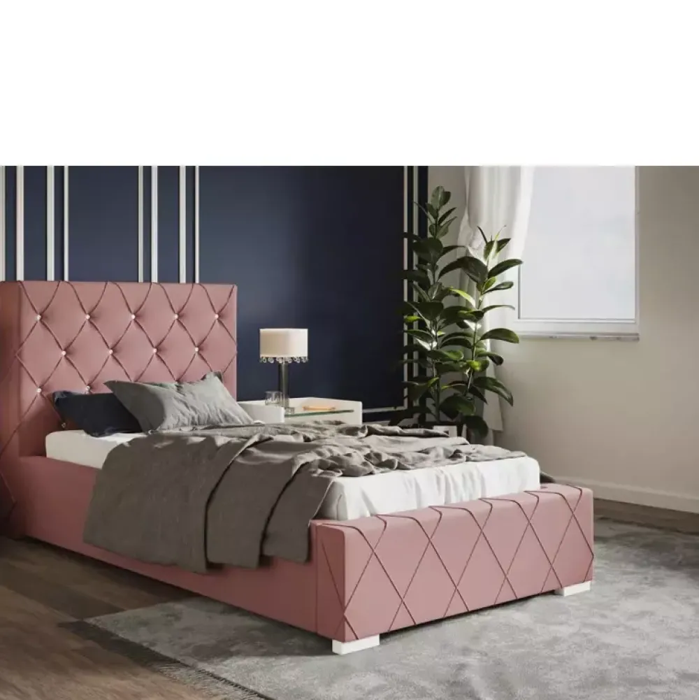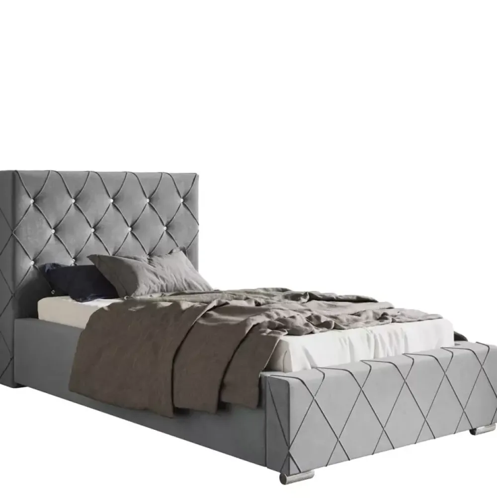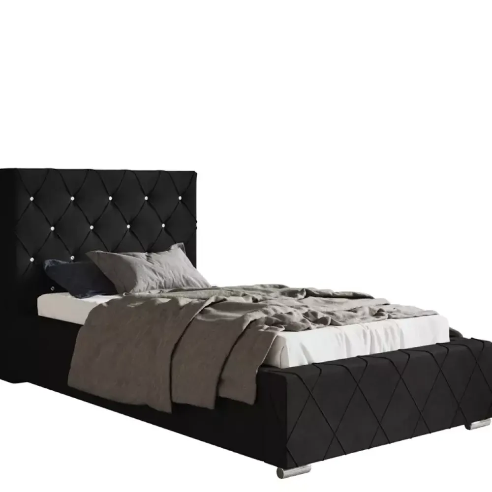 - Stylowe łóżko tapicerowane 90×200 cm z miękkim oparciem wykończonym w subtelny wzór caro z eleganckimi zakładkami. Wysokość zagłówka, rodzaj stelaża, kolor obicia tkanina można wybrać spośród opcji dostępnych w naszym konfiguratorze „Dopasuj i kup”.
