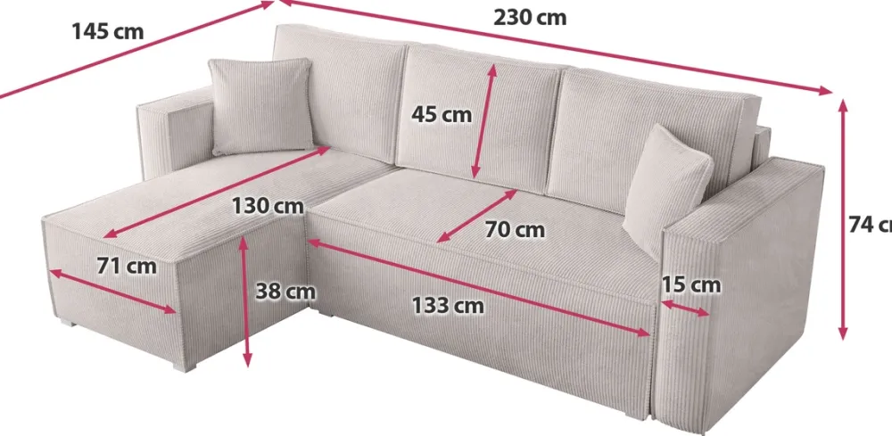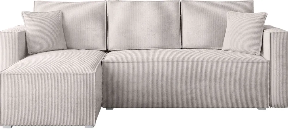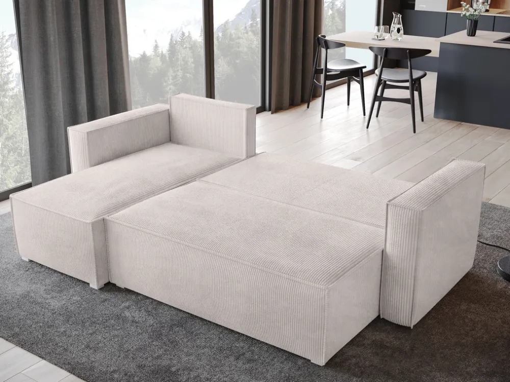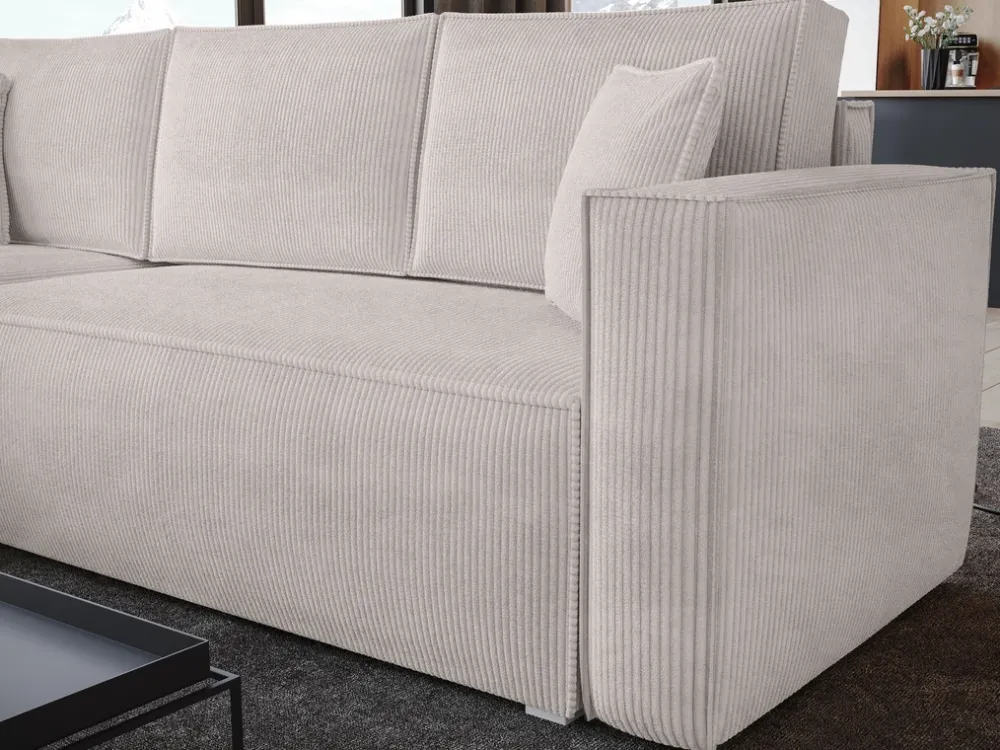 Jednak ten sztruksowy narożnik kryje w sobie jeszcze więcej – pojemnik na pościel oraz funkcję spania, to zestaw idealny na długie wieczory przy ulubionym filmie lub nocowania gości. W pojemniku ukryjesz koce czy poduszki, natomiast funkcja spania pozwoli Ci w parę chwil zorganizować komfortowe miejsce do snu lub odpoczynku.