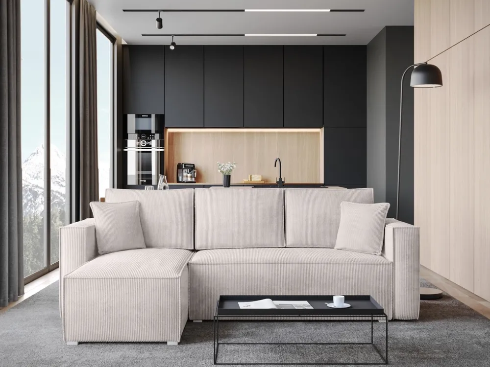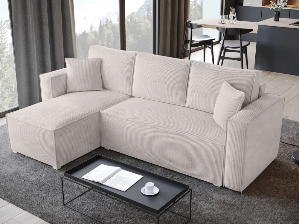 Rozkładany narożnik do salonu w delikatnym odcieniu beżu, doskonale wkomponuje się w każde wnętrze, nadając mu ciepła i przytulności. Narożnik z funkcją spania został obity wysokiej jakości sztruksową tkaniną Poso, która zachwyca nie tylko swoim wyglądem, ale również niezwykłą miękkością w dotyku. Sztruks to również bardzo popularny materiał, pasujący do wielu aranżacji.
