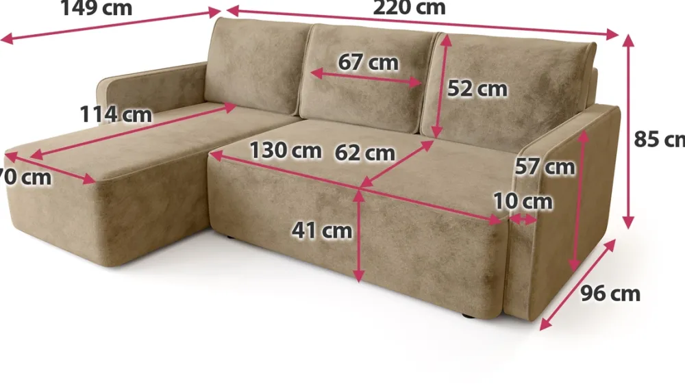 Zaproś do swojego salonu styl i funkcjonalność w najlepszym wydaniu. Ten narożnik to idealne połączenie komfortu, nowoczesnych rozwiązań i eleganckiego wyglądu. Dzięki funkcji spania o wymiarach 130×200 cm oraz zastosowaniu automatu DL, rozkładanie narożnika staje się szybkie i bezproblemowe. Siedzisko oparte na sprężynach falistych i piance PUR gwarantuje wygodę na najwyższym poziomie, a trzy grube poduchy oparciowe zapewniają optymalne wsparcie pleców podczas codziennego wypoczynku.
