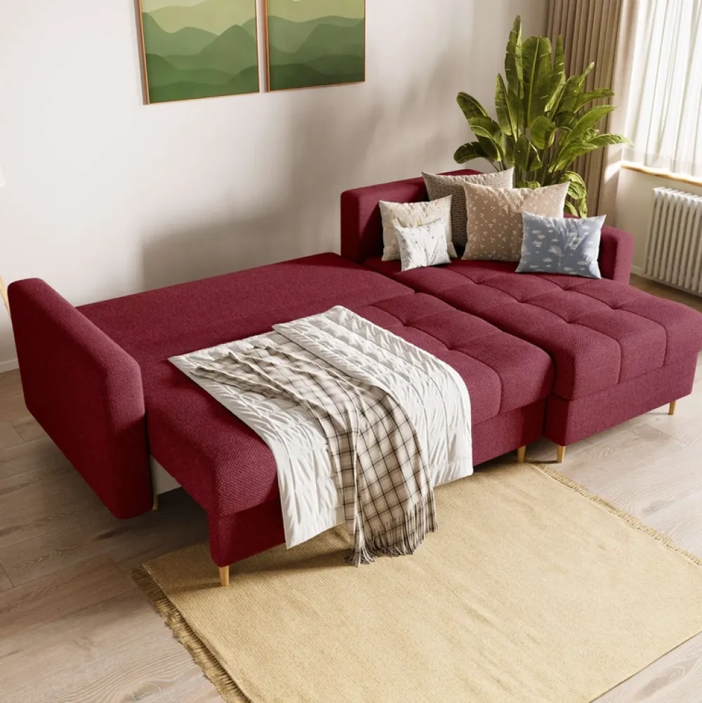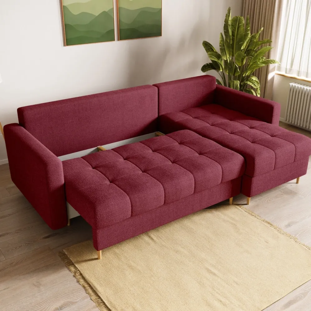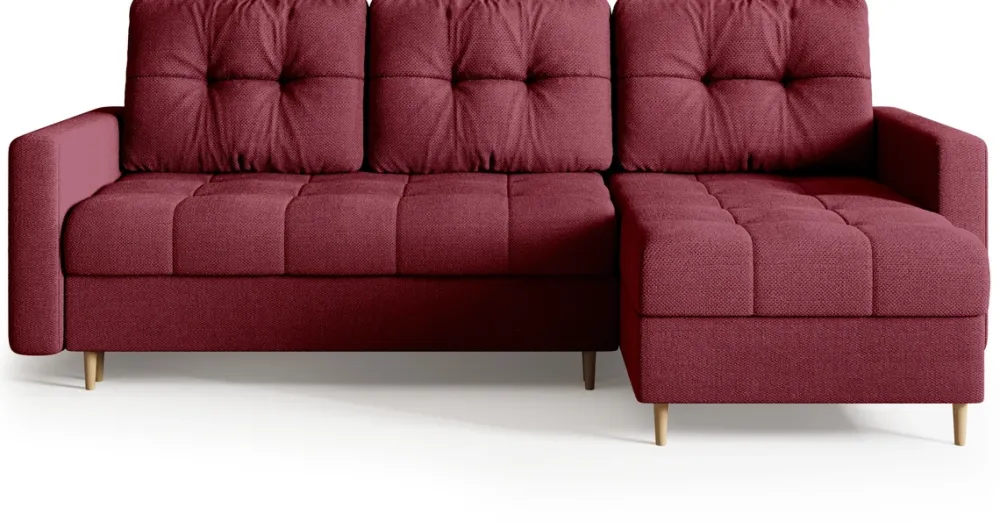 Wyposażony w funkcję spania o wymiarach 145×205 cm, ten narożnik zapewnia wygodne i przestronne miejsce do odpoczynku. Funkcja spania rozkładana jest za pomocą pociągnięcia siedziska do siebie oraz złożenia oparcia.