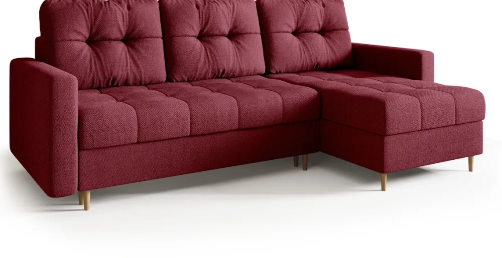 - Narożnik z funkcją spania LIZBONA posiada funkcję spania o wymiarze 145×205 cm. Pod pikowanym siedziskiem na bazie pianki PUR znajduje się pojemnik na pościel i poduszki. Wysokie nóżki wykonano z drewna. Poduszki dołączamy w zestawie.