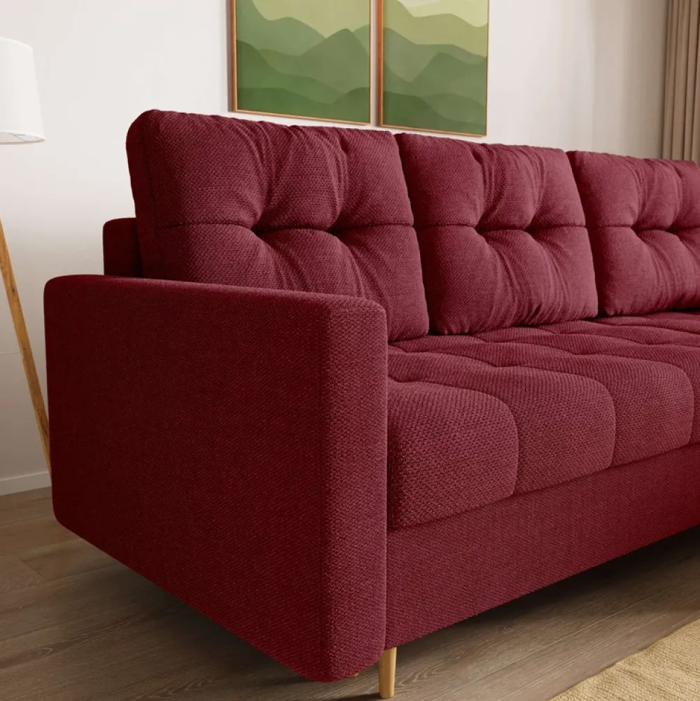 Wysokie, drewniane nóżki nie tylko dodają narożnikowi lekkości i elegancji, ale również ułatwiają utrzymanie czystości pod meblem. Trzy poduszki oparciowe, które są zarówno funkcjonalne, jak i dekoracyjne, dodają charakteru i są łatwe do dostosowania według indywidualnych potrzeb.