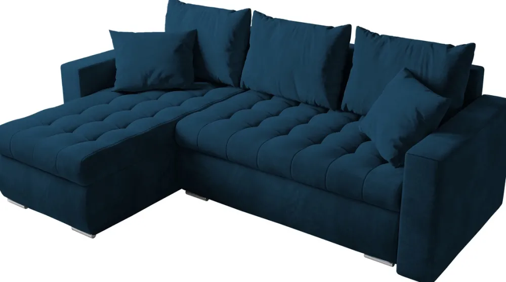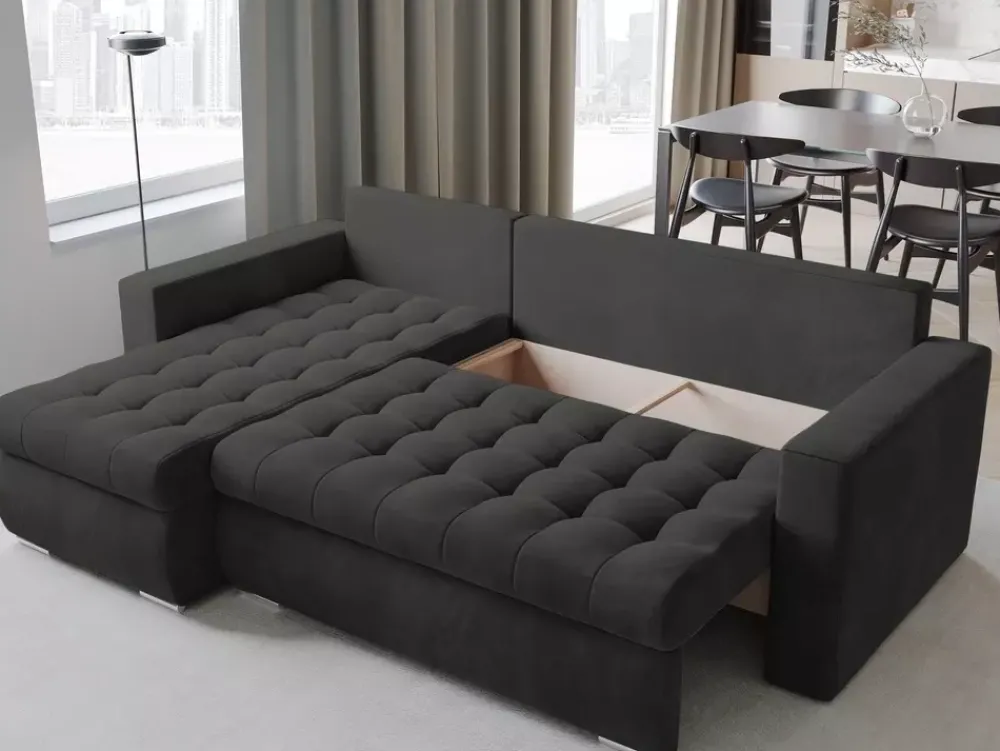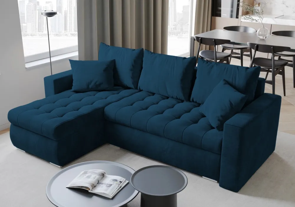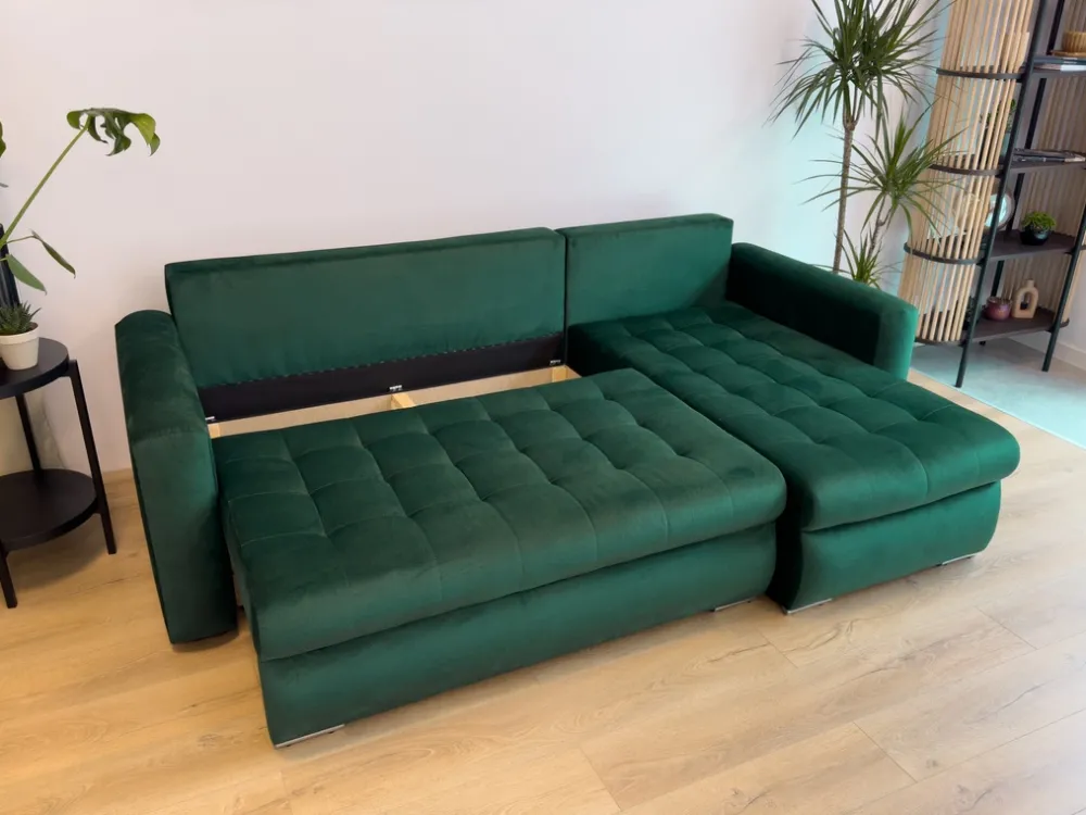Pod siedziskiem narożnika zintegrowany jest pojemnik na pościel, który oferuje dodatkową przestrzeń do przechowywania. To praktyczne rozwiązanie pozwala utrzymać porządek i mieć zawsze pod ręką dodatkowe koce czy pościel.