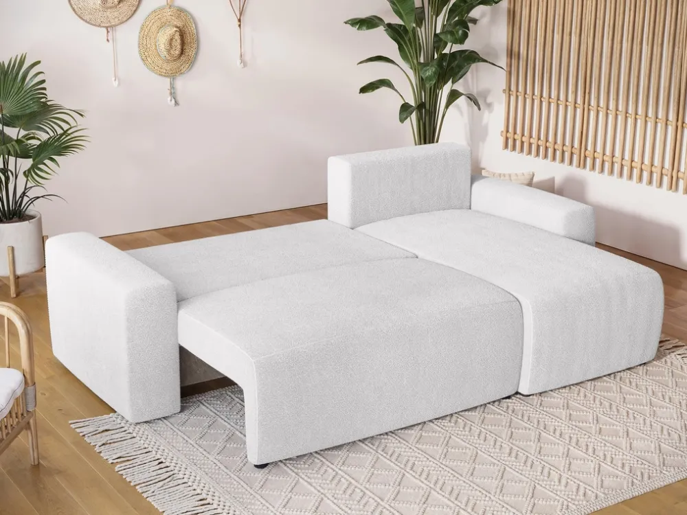 - Funkcja spania o powierzchni 125×200 cm oferuje wygodne miejsce do drzemki lub okazjonalnego snu. Narożnik jest rozkładany za pomocą pociągnięcia siedziska do siebie, oraz złożenia oparcia.