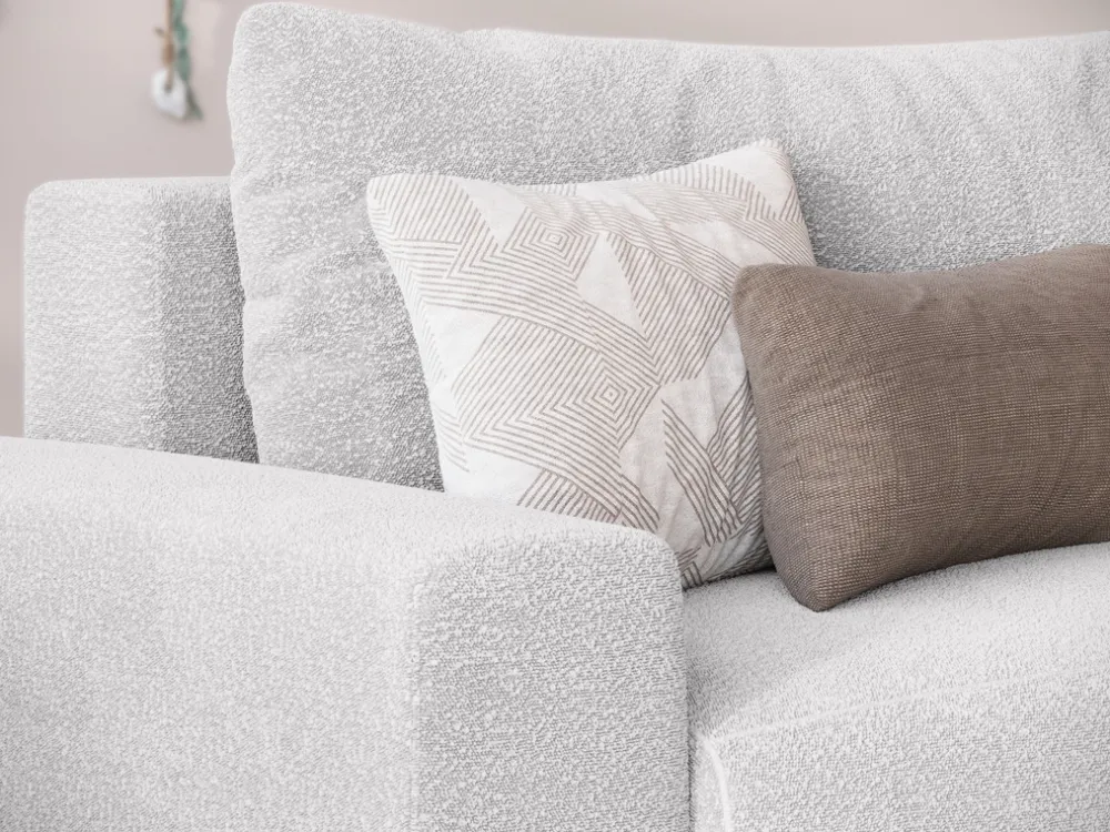 - Narożnik posiada tapicerowane plecy w tej samej tkaninie co reszta mebla, oznacza to, że można ustawić mebel nawet pośrodku salonu.