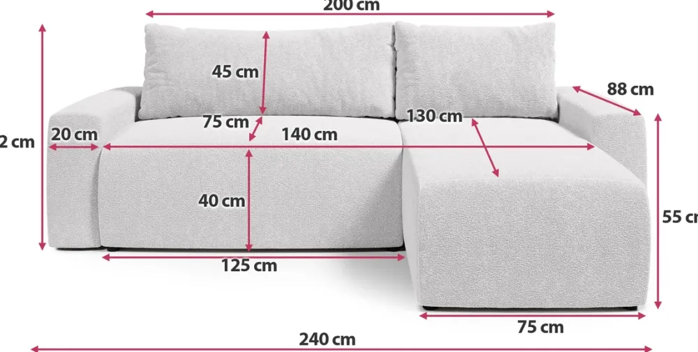 - Kanapa narożna z funkcją spania PLUSH L została wykonana w tkaninie typu baranek. Narożnik posiada funkcję spania 125×200 cm, siedzisko wykonane na bazie sprężyn falistych typu B oraz pianki PUR. Poduchy posiadają wypełnienie ze śruty pianki PUR.