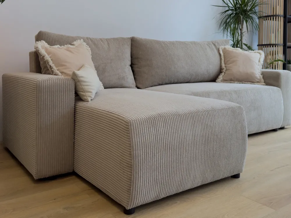 Pod siedziskiem narożnika znajduje się praktyczny pojemnik na pościel, który umożliwia wygodne przechowywanie kołder, poduszek czy koców. To idealne rozwiązanie, które pomoże utrzymać porządek w Twoim salonie.