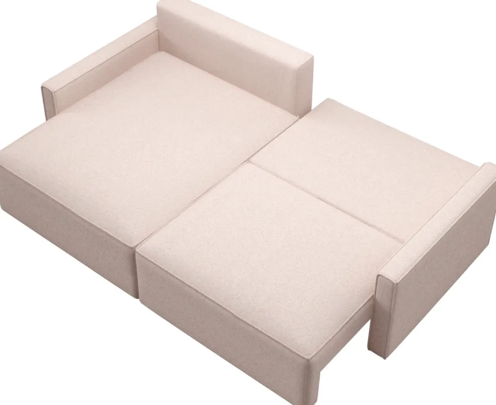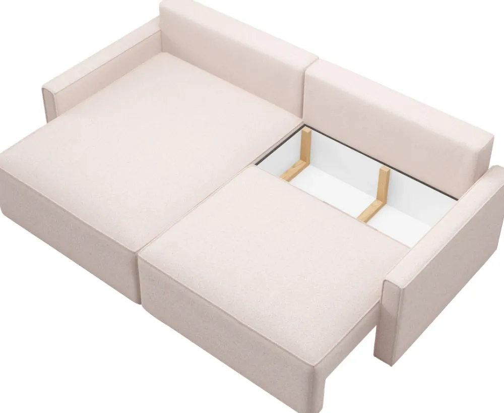 - Pod siedziskiem znajduje się praktyczny schowek na pościel, który pozwala na przechowywanie koców, poduszek, kołder czy innych tekstyliów, pomagając utrzymać porządek w salonie.