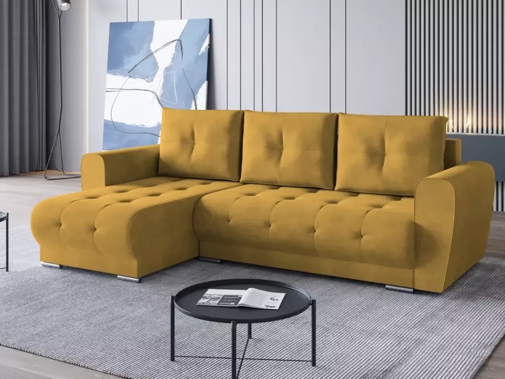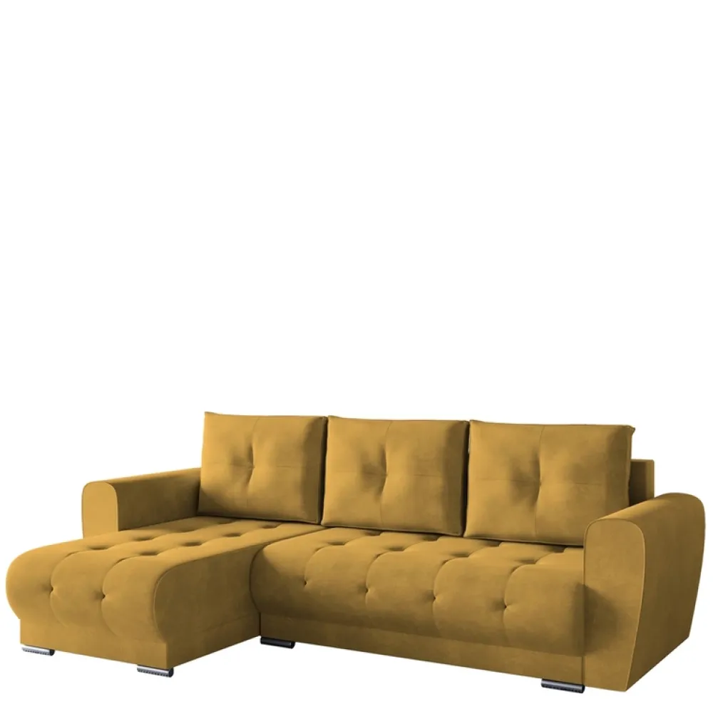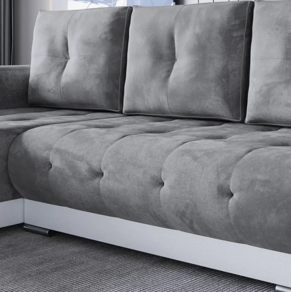 Kanapa narożna z funkcją spania stoi na eleganckich chromowanych nóżkach, które dodają jej eleganckiego i nowoczesnego charakteru. Ich lśniący wygląd dodaje kanapie niewątpliwej atrakcyjności i jest dowodem na niezrównaną dbałość o szczegóły.