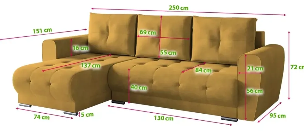 - Kanapa narożna DOMI została wyposażona w funkcję spania o powierzchni 130×200 cm. Dodatkowo pojemnik na pościel pozwala przechować znaczną część elementów, a jej nowoczesna stylistyka sprawia że doskonale wpisuje się we współczesne trendy wystroju wnętrz.