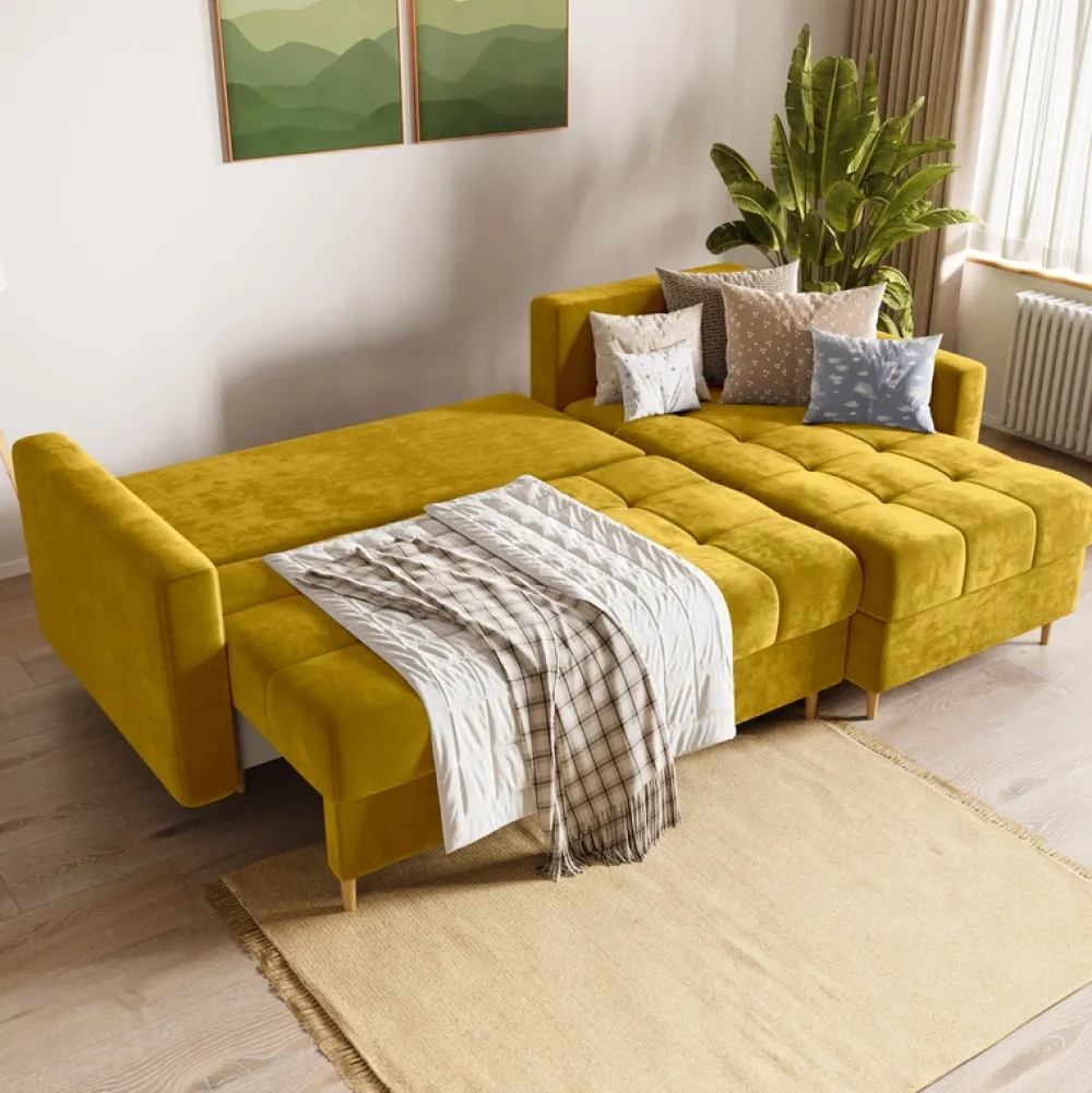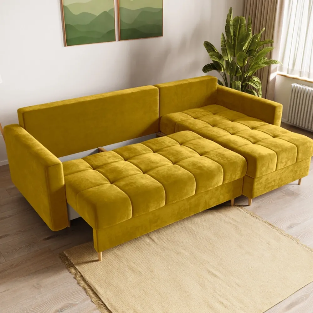 Wyposażony w funkcję spania o wymiarach 145×205 cm, ten narożnik zapewnia wygodne i przestronne miejsce do odpoczynku. Funkcja spania rozkładana jest za pomocą pociągnięcia siedziska do siebie oraz złożenia oparcia.