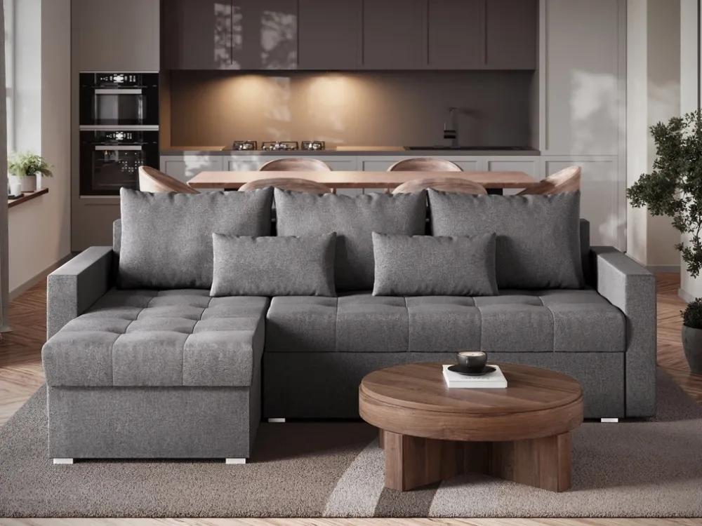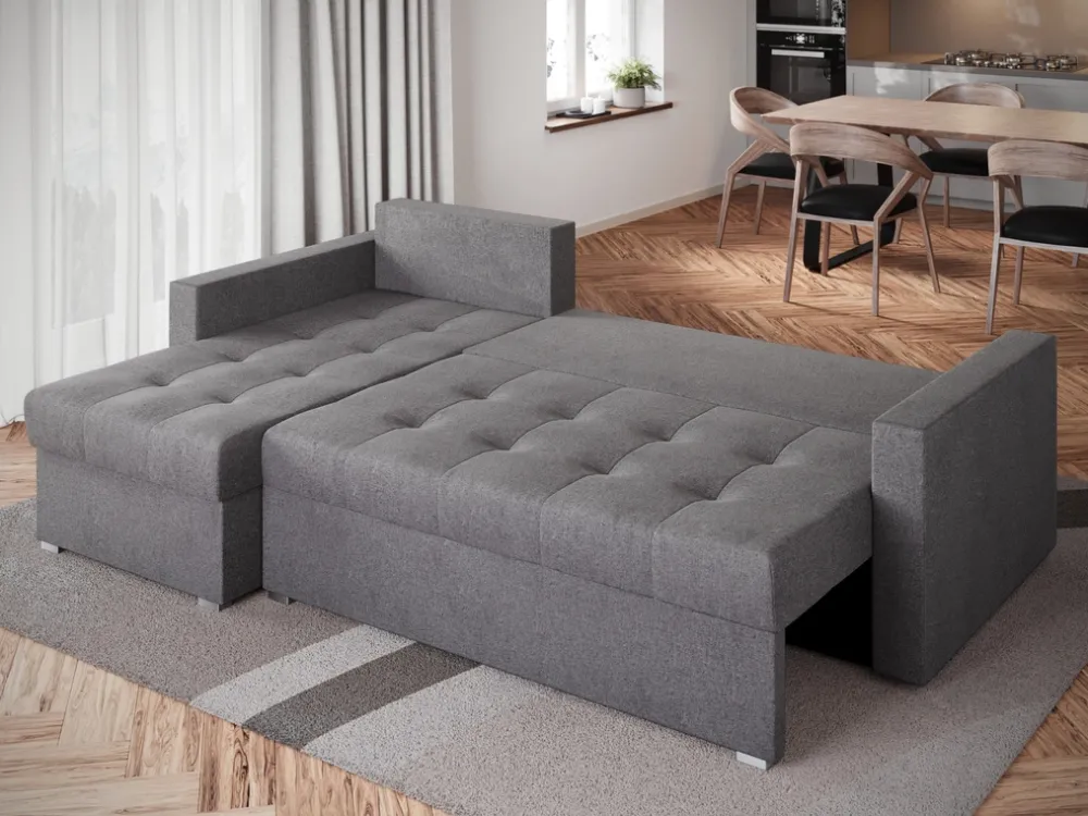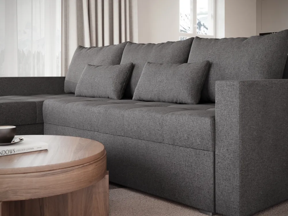 Pod siedziskiem narożnika znajduje się pojemnik na pościel, który pozwala na łatwe i estetyczne przechowywanie dodatkowych kołder, poduszek czy prześcieradeł. To idealne rozwiązanie dla tych, którzy cenią sobie porządek i chcą mieć wszystko pod ręką.