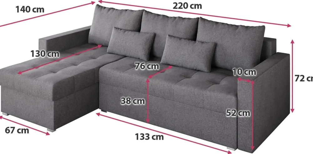 - Narożnik posiada funkcję spania o powierzchni 120×200 cm. Rozkładanie odbywa się za pomocą pociągnięcia siedziska do siebie oraz złożenia oparcia.