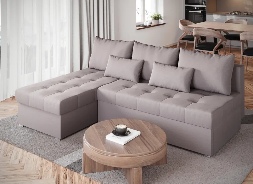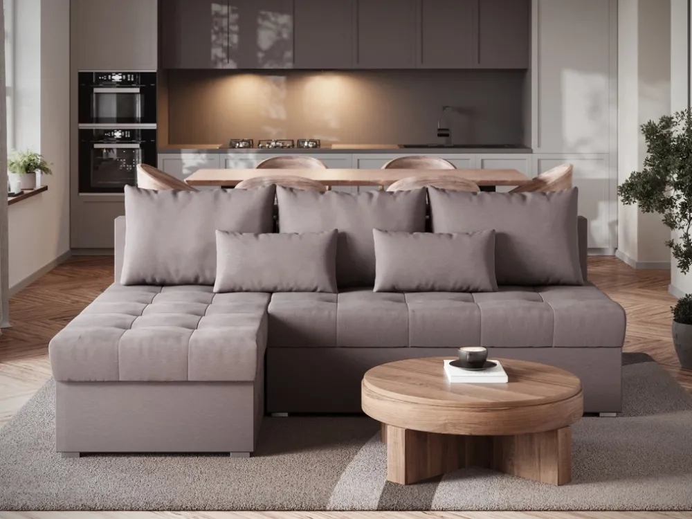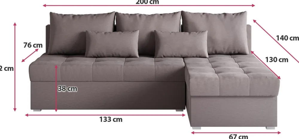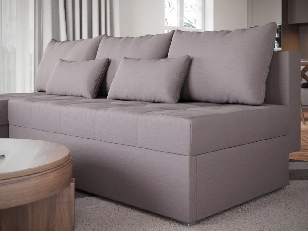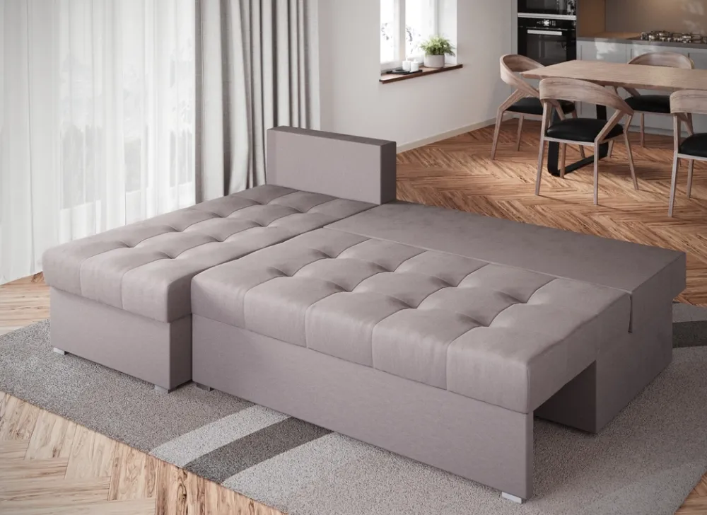 Narożnik wyposażony jest w funkcję spania, co sprawia, że w kilka chwil można zamienić go w łóżko o powierzchni 120×200 cm. To praktyczne rozwiązanie, które idealnie sprawdzi się podczas wizyt gości, a także pozwoli zaoszczędzić miejsce w salonie. Pod siedziskiem znajduje się pojemny schowek na pościel, który umożliwia wygodne przechowywanie koców, poduszek czy dodatkowej pościeli – wszystko w zasięgu ręki.