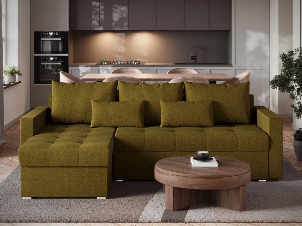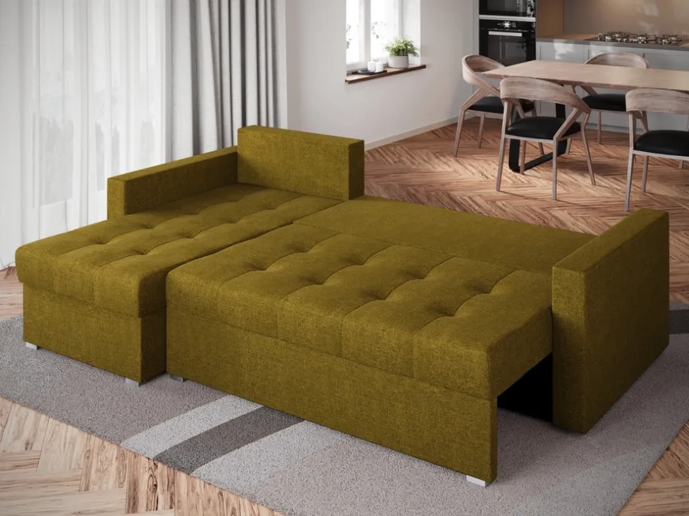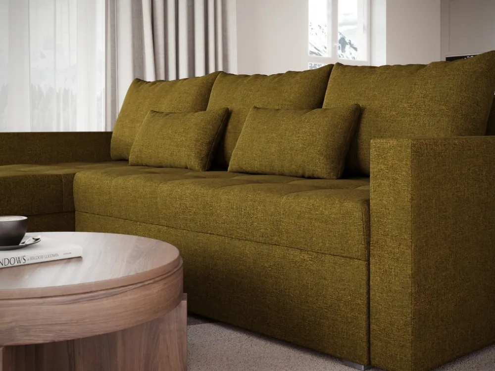 Pod siedziskiem narożnika znajduje się pojemnik na pościel, który pozwala na łatwe i estetyczne przechowywanie dodatkowych kołder, poduszek czy prześcieradeł. To idealne rozwiązanie dla tych, którzy cenią sobie porządek i chcą mieć wszystko pod ręką.