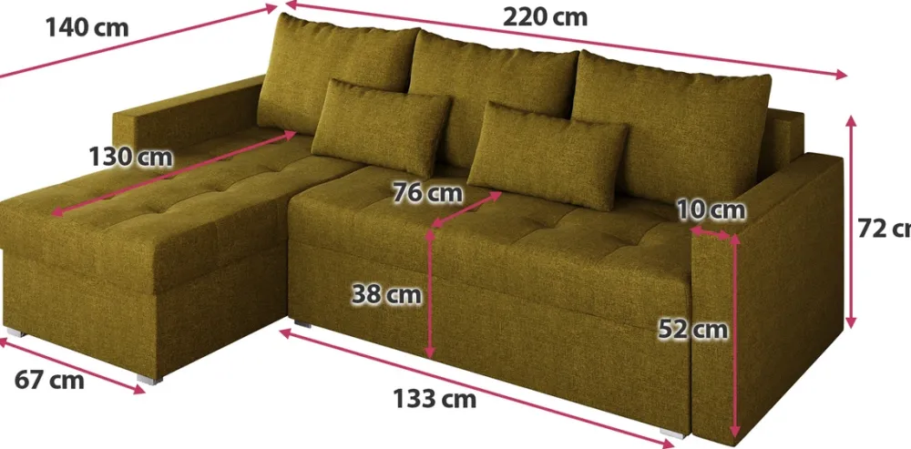- Narożnik z funkcją spania 120×200 cm. Posiada pojemnik na pościel pod siedziskiem, siedzisko wykonane na bazie pianki PUR oraz tapicerowane plecy, dzięki którym może stanąć nawet pośrodku salonu. Narożnik jest dostępny w wielu kolorach i rodzajach tkanin.