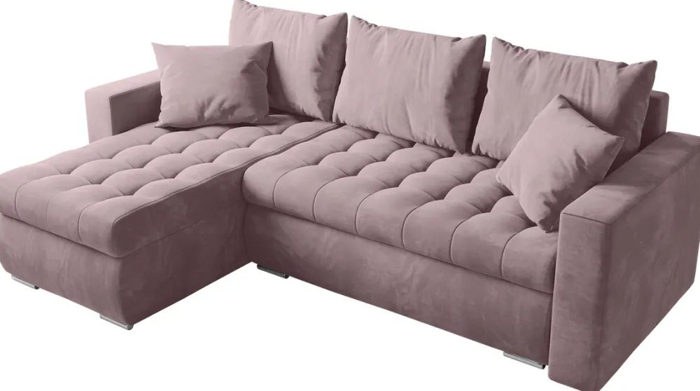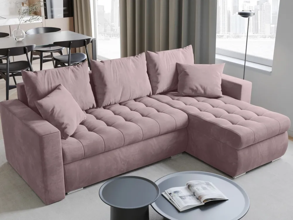 Design rozkładanego narożnika do salonu jest jednocześnie nowoczesny i elegancki. Chromowane nóżki dodają błyskawicznego blasku, który ożywi każde pomieszczenie, podczas gdy proste linie i geometryczne kształty podkreślają nowoczesny styl.