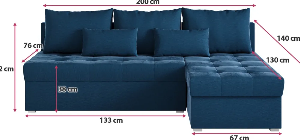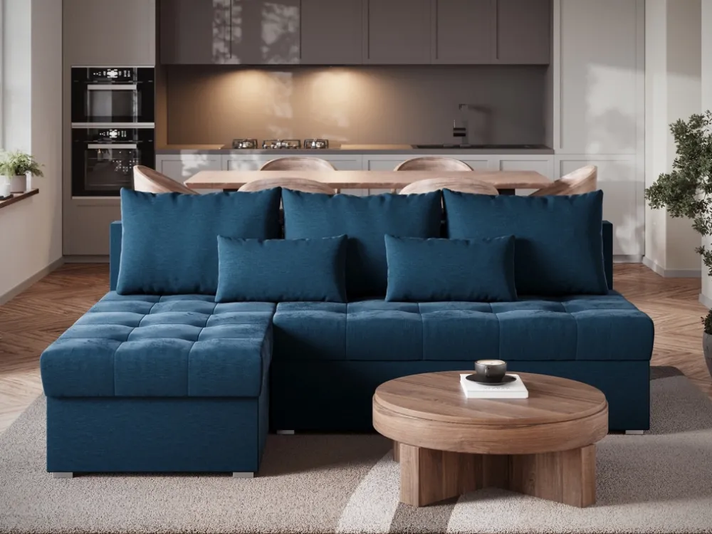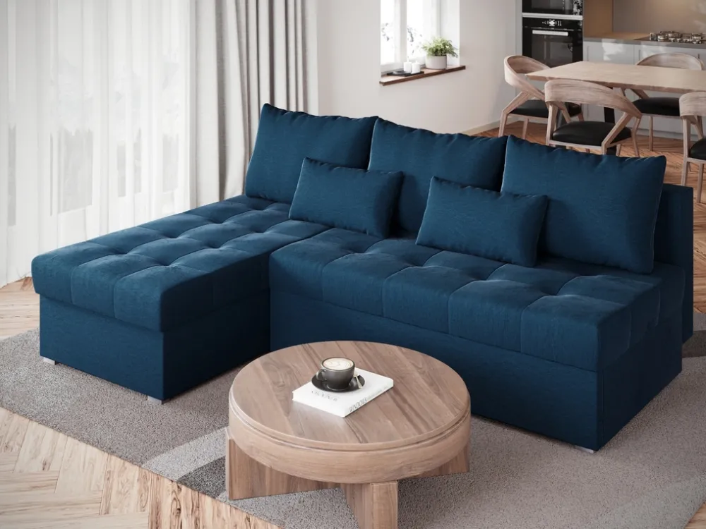 Narożnik wyposażony jest w funkcję spania, co sprawia, że w kilka chwil można zamienić go w łóżko o powierzchni 120×200 cm. To praktyczne rozwiązanie, które idealnie sprawdzi się podczas wizyt gości, a także pozwoli zaoszczędzić miejsce w salonie. Pod siedziskiem znajduje się pojemny schowek na pościel, który umożliwia wygodne przechowywanie koców, poduszek czy dodatkowej pościeli – wszystko w zasięgu ręki.