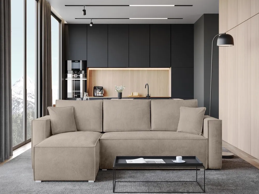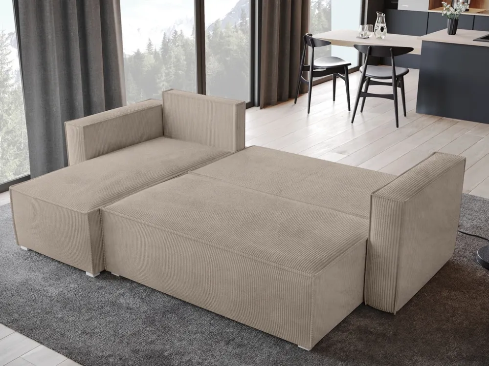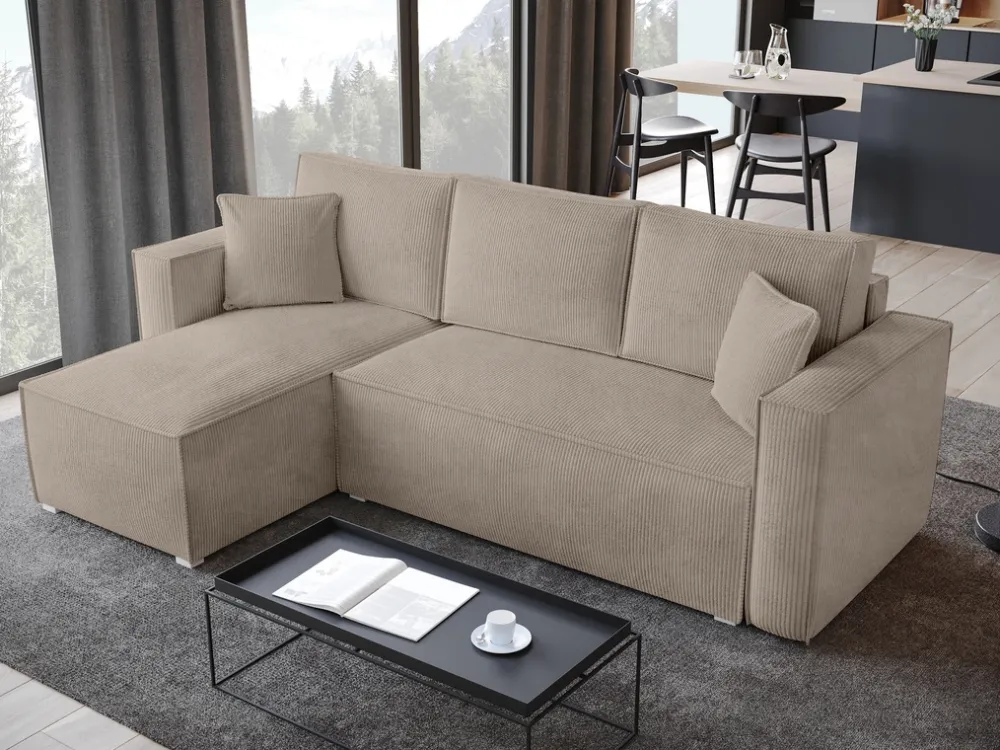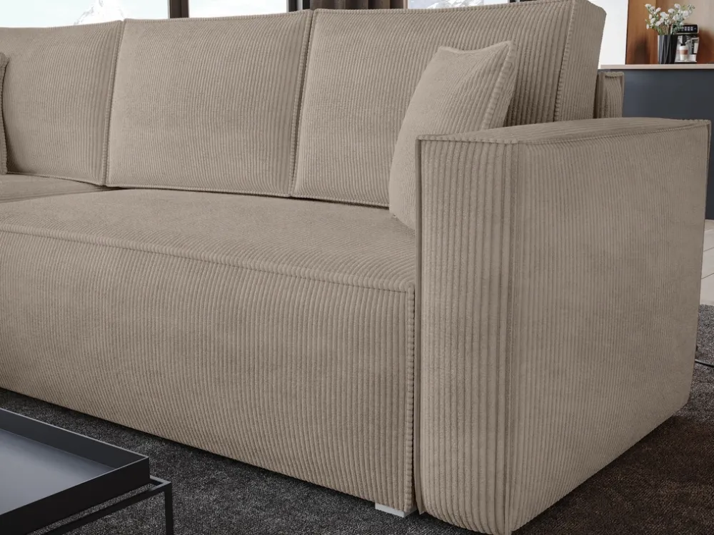 Sztruksowy narożnik do salonu, dzięki funkcji spania może być łatwo i szybko przekształcony w przestronne miejsce do snu. Będzie to niezwykle przydatne, gdy goście zdecydują się zostać na noc lub gdy postanowisz uciąć sobie regenerującą drzemkę.