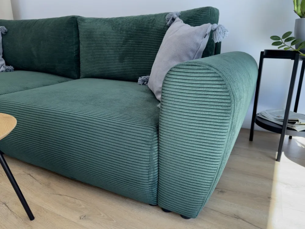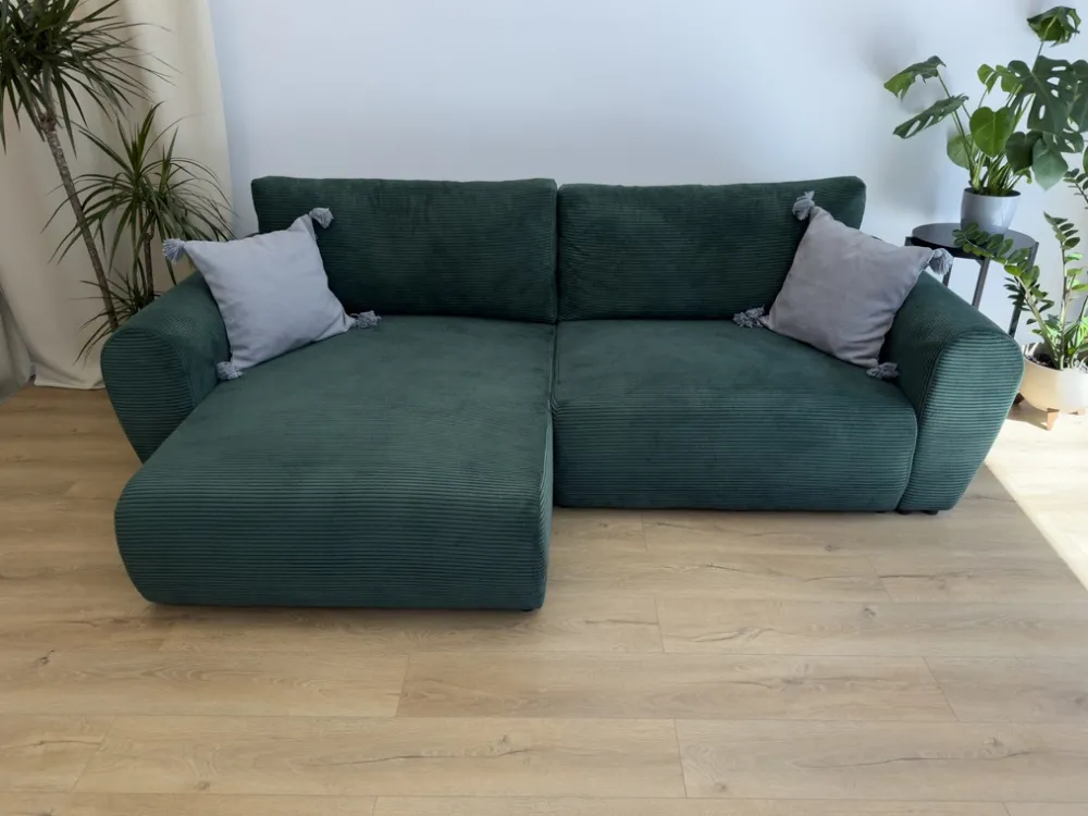 Dodatkową zaletą jest możliwość wyboru strony, po której znajdować się będzie otomana. Dzięki temu rozwiązaniu rozkładany narożnik sztruksowy można dopasować do różnych wnętrz i układu salonu. Niezależnie od tego, czy posiadasz duże, otwarte przestrzenie, czy kameralne wnętrze, ten narożnik będzie świetnym dodatkiem, łączącym elegancję z praktycznością. Stronę po której będzie znajdować się otomana wybiera się podczas montażu i można ją w dowolnej chwili zmienić.