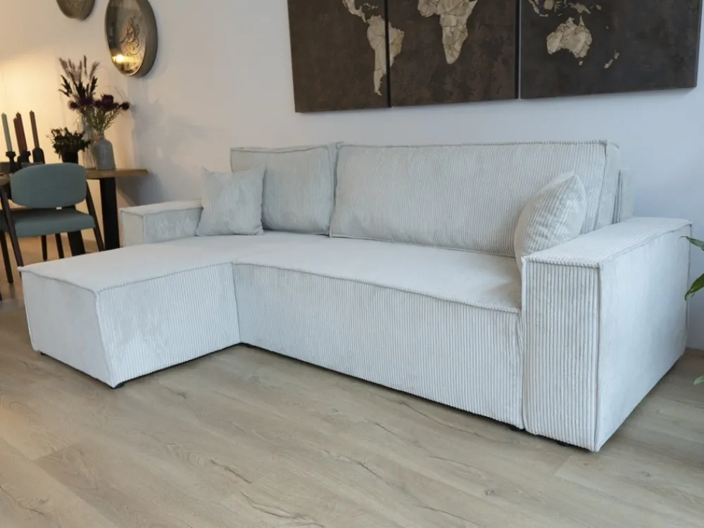 Tkanina sztruksowa nadaje meblowi wyjątkowy charakter – jest ciepła, przyjemna w dotyku i świetnie komponuje się z nowoczesnymi, jak i bardziej klasycznymi wnętrzami. To połączenie wygody, funkcjonalności i designu, które odmieni Twój salon.