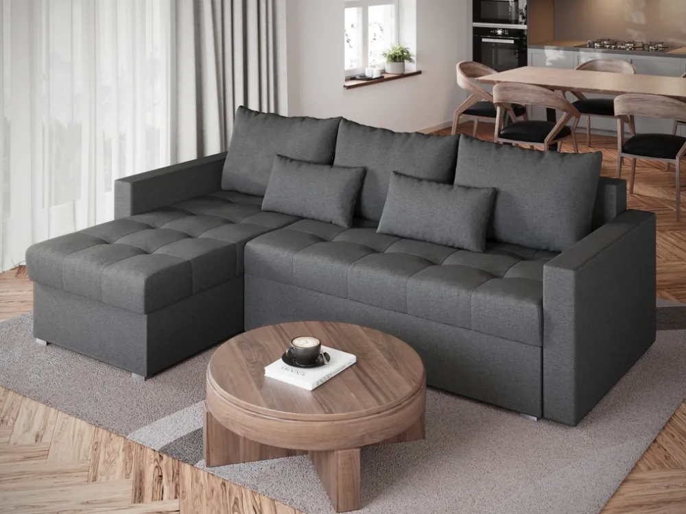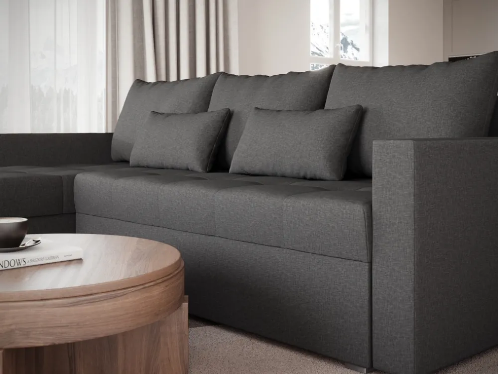 Nasz narożnik został zaprojektowany z myślą o maksymalnym wykorzystaniu przestrzeni. Wyposażony w funkcję spania o wymiarach 120×200 cm, idealnie sprawdzi się jako dodatkowe miejsce do spania dla gości. Narożnik rozkłada się za pomocą pociągnięcia siedziska do siebie.