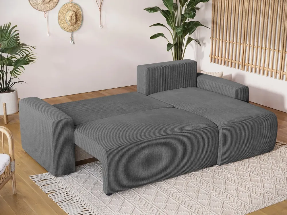- Funkcja spania o powierzchni 125×200 cm oferuje wygodne miejsce do drzemki lub okazjonalnego snu. Narożnik jest rozkładany za pomocą pociągnięcia siedziska do siebie, oraz złożenia oparcia.