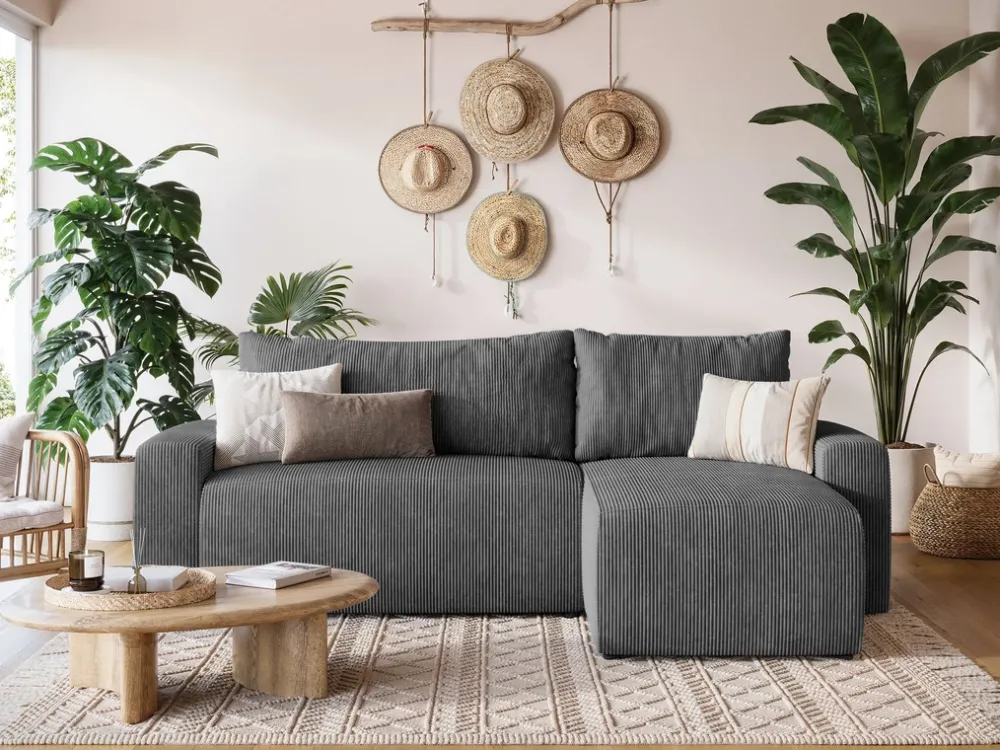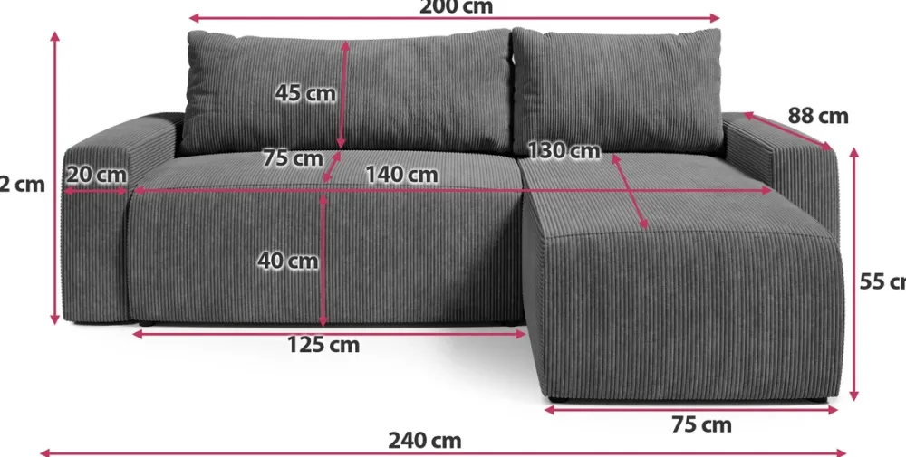 - Sztruksowy narożnik z funkcją spania PLUSH L posiada głęboki pojemnik na pościel, w którym można przechować poduszki i koce. Siedzisko wykonano na bazie sprężyn falistych oraz pianki PUR. Funkcja spania o wymiarze 125 x 200 cm. Wiele dostepnych tkanin.