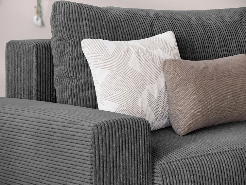 Narożnik wyposażony jest w dwie duże poduchy oparciowe, które zapewniają wygodne podparcie dla pleców i podnoszą komfort użytkowania. Całość pokryta jest tkaniną sztruksową, która jest nie tylko miła w dotyku, ale również nadaje meblowi elegancki wygląd. Dodatkowym atutem są tapicerowane plecy, dzięki czemu narożnik prezentuje się świetnie z każdej strony i może być ustawiony w dowolnym miejscu w salonie.