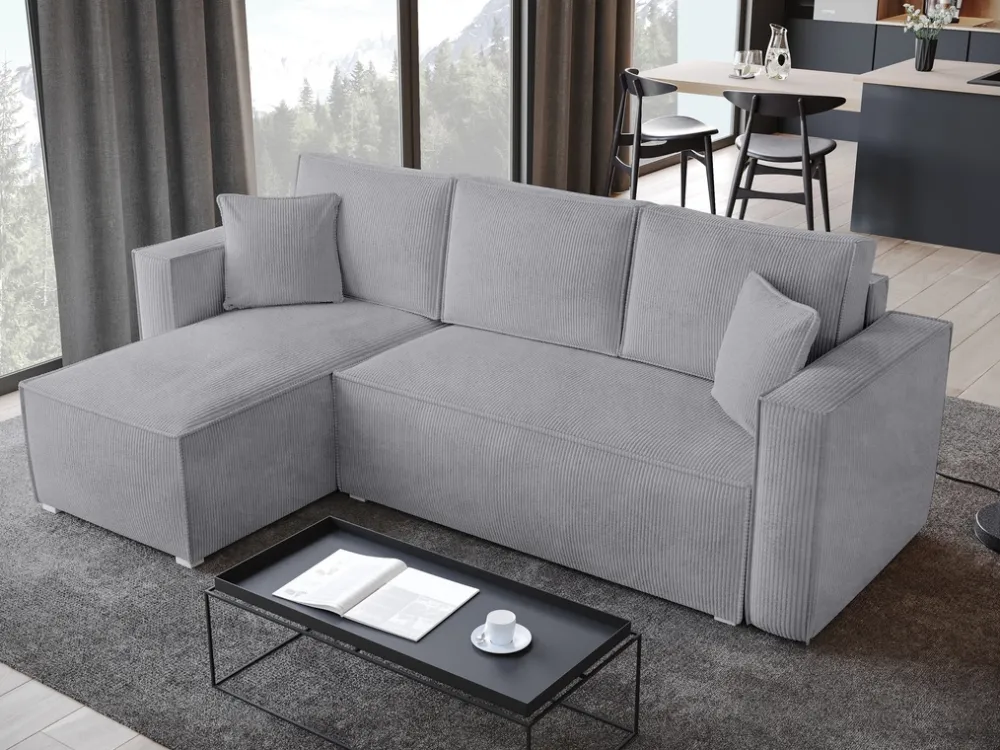 Narożnik posiada możliwość zmontowania w orientacji lewostronnej lub prawostronnej. Pozwala to na dostosowanie mebla do układu pomieszczenia, dzięki czemu podczas przemeblowania, wystarczy przełożyć wysuniętą część narożnika na drugą stronę, aby idealnie wpasowywał się w aranżacje.