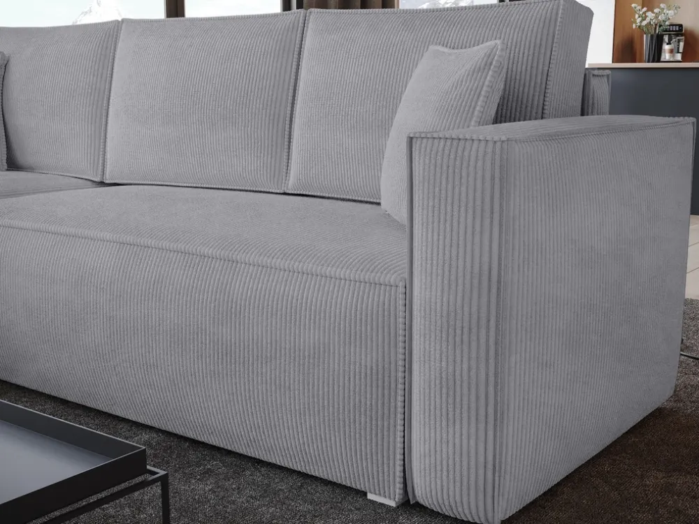 - Tył narożnika sztruksowego obity w wybranym wariancie kolorystycznym pozwala na umieszczenie mebla nawet pośrodku salonu.