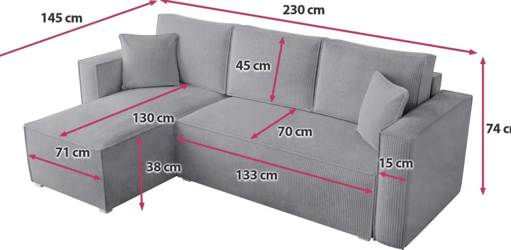 Przemyślane rozwiązania, takie jak pojemnik na pościel pod siedziskiem oraz łatwa w obsłudze funkcja spania, czynią ten narożnik idealnym wyborem dla tych, którzy cenią praktyczność.