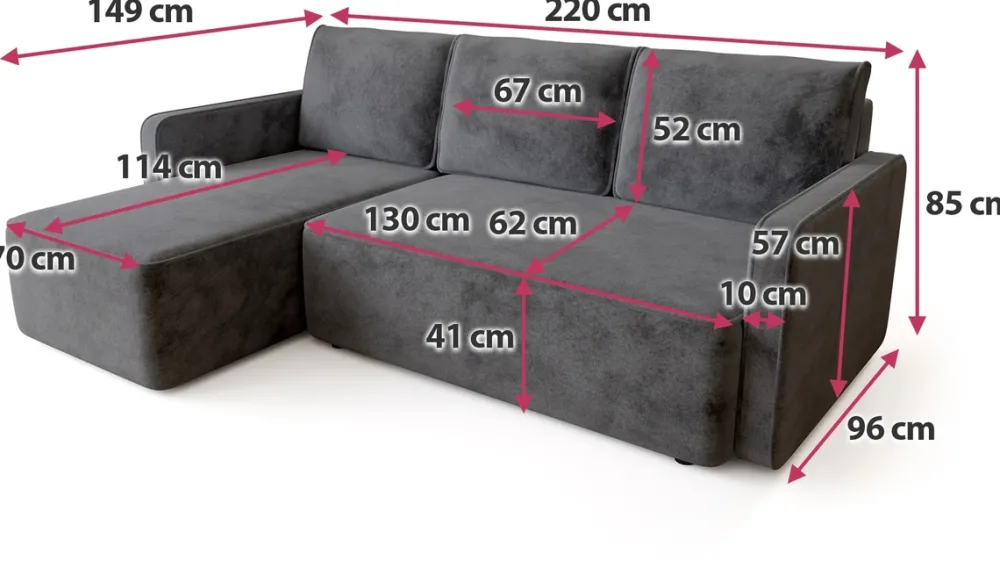 Zaproś do swojego salonu styl i funkcjonalność w najlepszym wydaniu. Ten narożnik to idealne połączenie komfortu, nowoczesnych rozwiązań i eleganckiego wyglądu. Dzięki funkcji spania o wymiarach 130×200 cm oraz zastosowaniu automatu DL, rozkładanie narożnika staje się szybkie i bezproblemowe. Siedzisko oparte na sprężynach falistych i piance PUR gwarantuje wygodę na najwyższym poziomie, a trzy grube poduchy oparciowe zapewniają optymalne wsparcie pleców podczas codziennego wypoczynku.