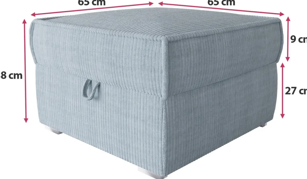 - Pufa ze schowkiem TOP posiada siedzisko wykonane na bazie pianki PUR, która odpowiada za komfort podczas siedzenia. Pufa została wykonana z przyjemnej w dotyku tkaninie sztruksowej Poso, która charakteryzuje się swoją teksturą i wytrzymałością.