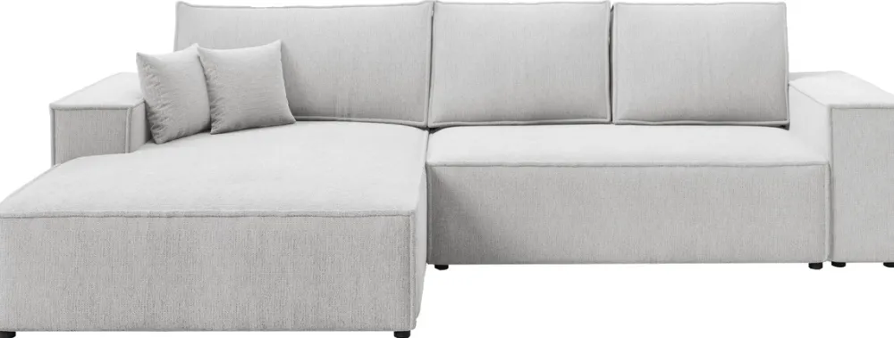 Dostępny w orientacji lewo lub prawostronnej, narożnik ten można dostosować do układu pomieszczenia. Tapicerowane plecy w tej samej tkaninie, co reszta mebla, pozwalają na swobodne ustawienie w dowolnym miejscu, a eleganckie, miękkie poduszki – trzy duże i dwie mniejsze – podnoszą komfort użytkowania, jednocześnie dodając stylu całej konstrukcji.
