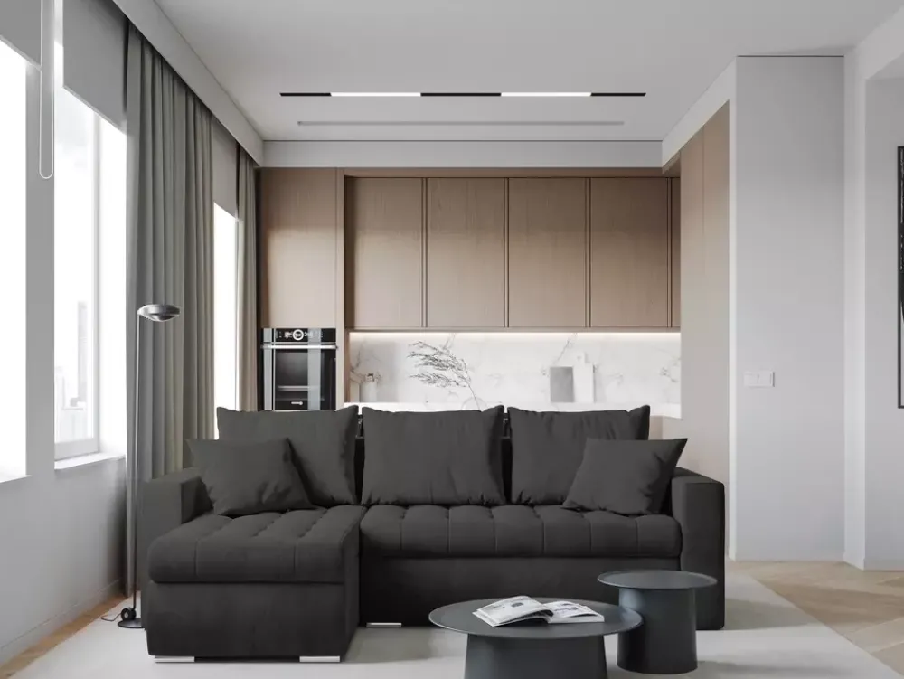 Dodatkowo, szary rozkładany narożnik wyposażony jest w pojemnik na pościel, dyskretnie ukryty pod siedziskiem. Ten sprytny element pozwala na oszczędzanie miejsca i utrzymanie porządku, bez rezygnacji z szybkiego dostępu do dodatkowych koców, poduszek czy pościeli.