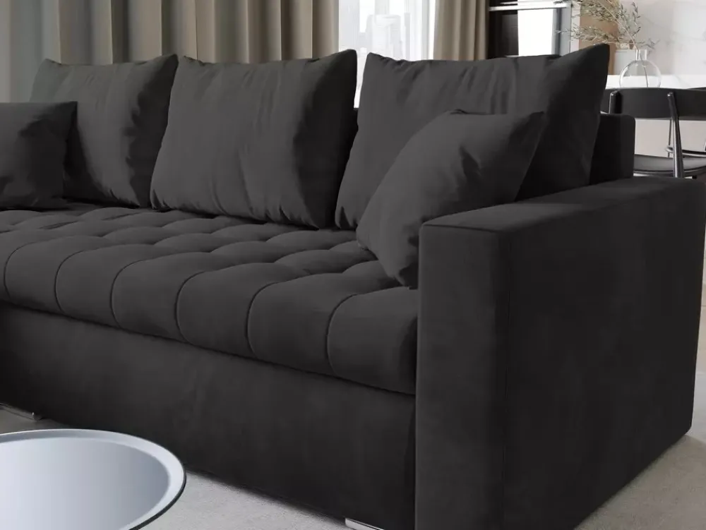 - Narożnik LUIS został wyposażony w funkcję spania oraz głęboki pojemnik na pościel, co pozwala zapewnić komfort wypoczynku dla gości i nie tylko. Kanapa narożna posiada również trzy grube poduchy oparciowe oraz dwie mniejsze.