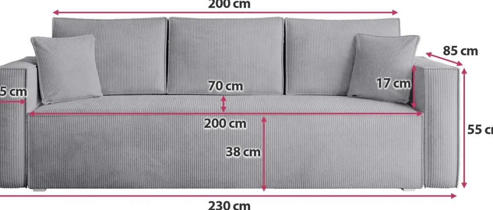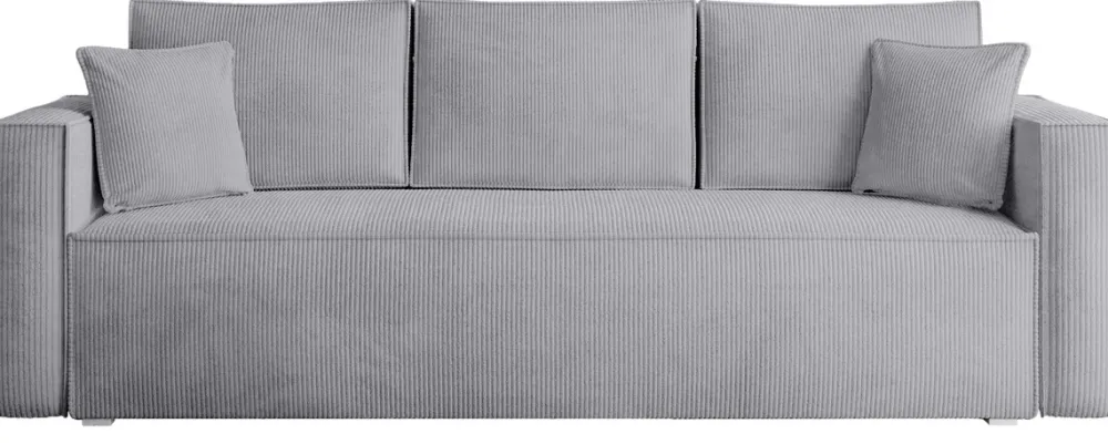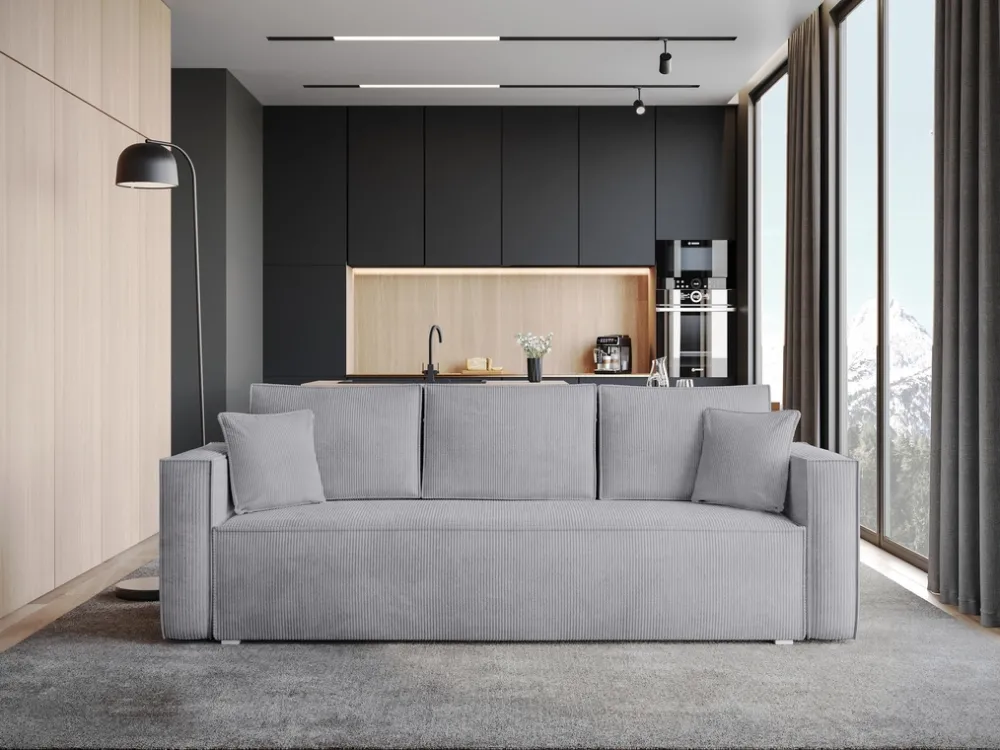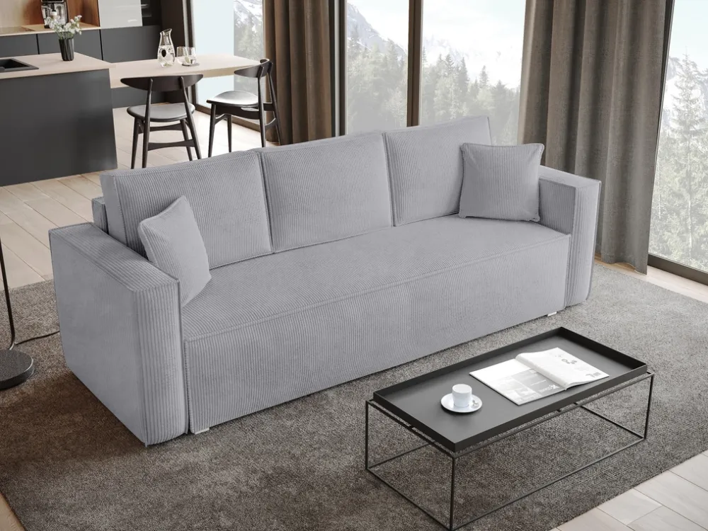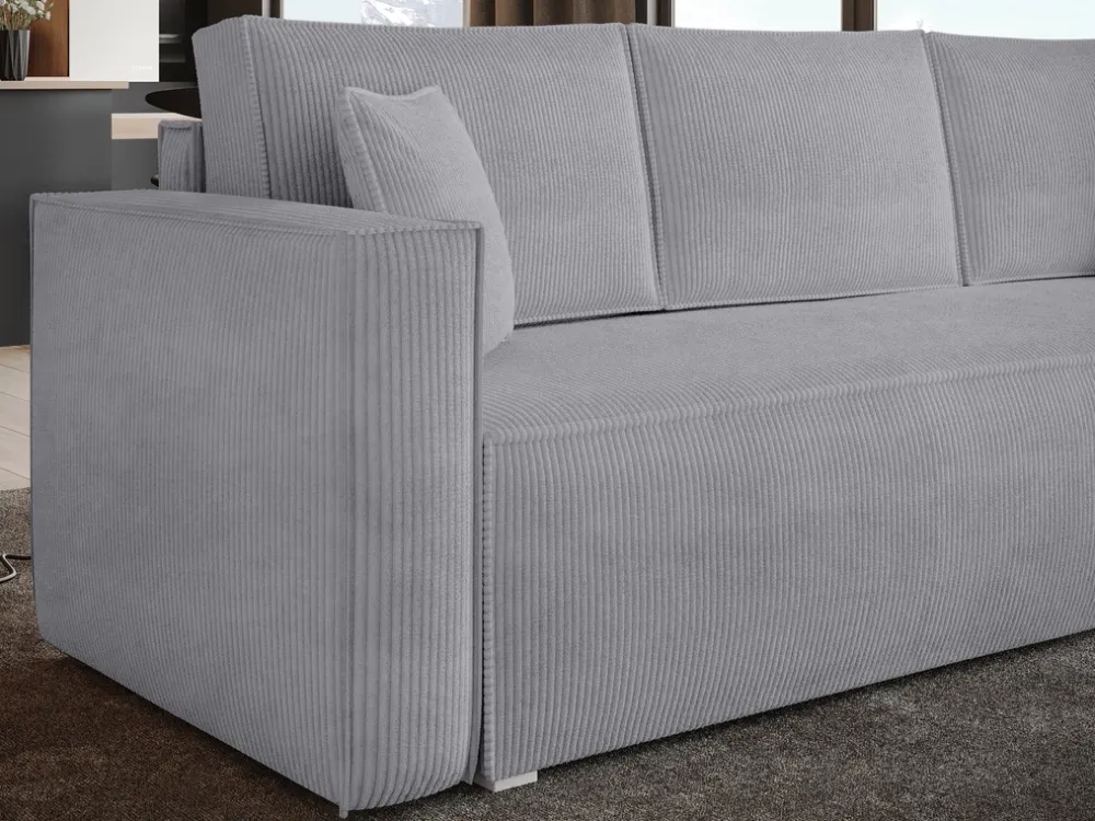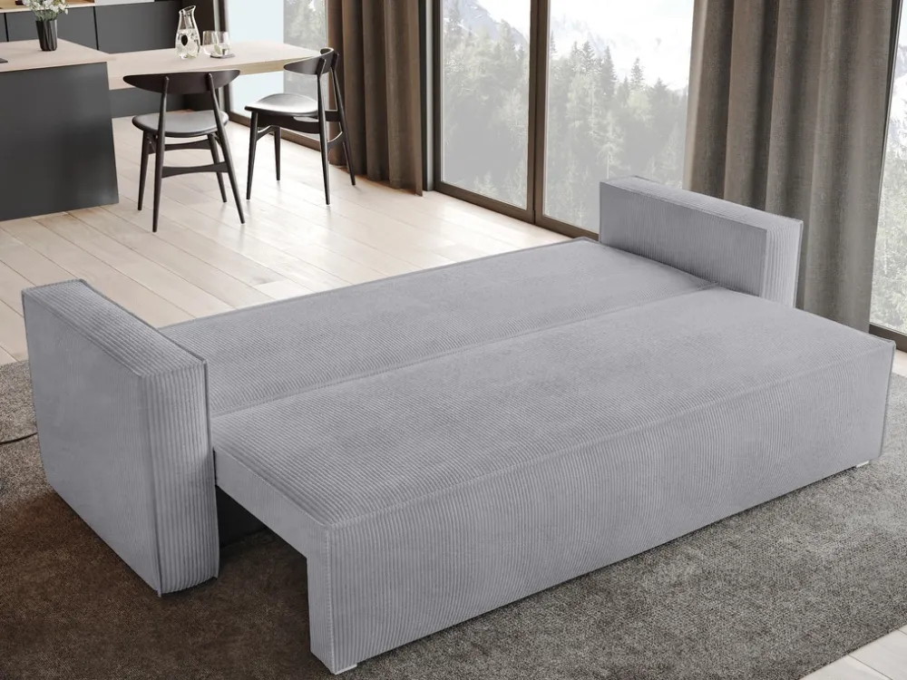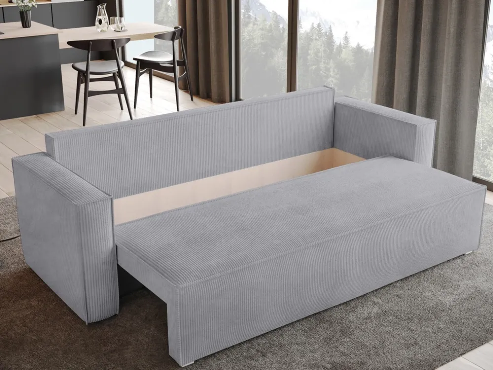 Sztruksowa sofa z funkcją spania została zaprojektowana z myślą o praktyczności. Pod siedziskiem znajduje się pojemnik na pościel, co pozwala na składowanie pościeli, koców lub poduszek bez konieczności zajmowania dodatkowej przestrzeni w szafie.
