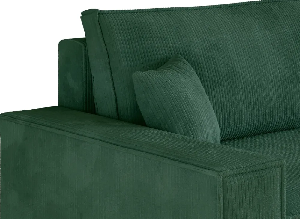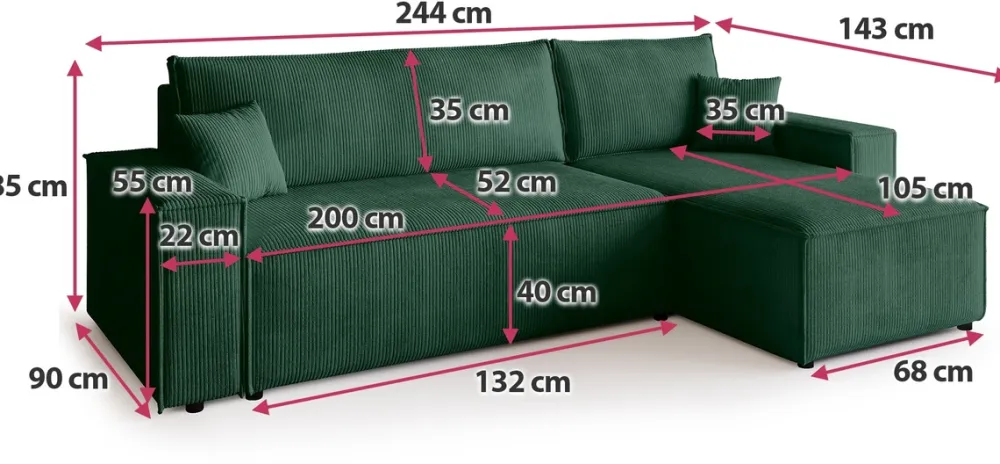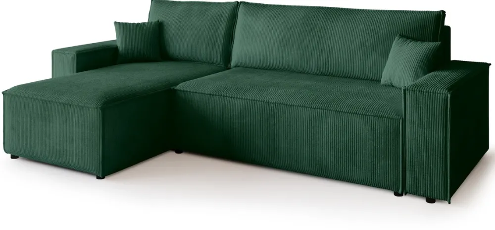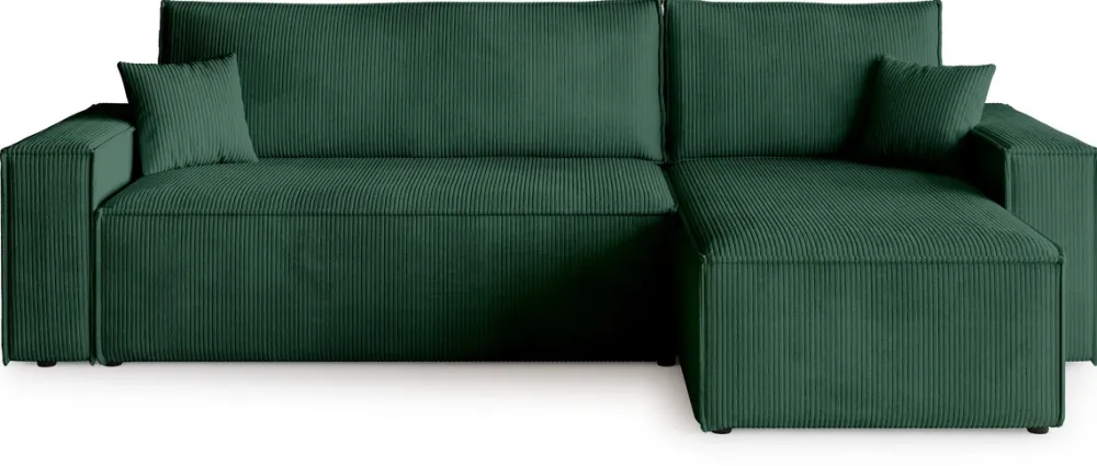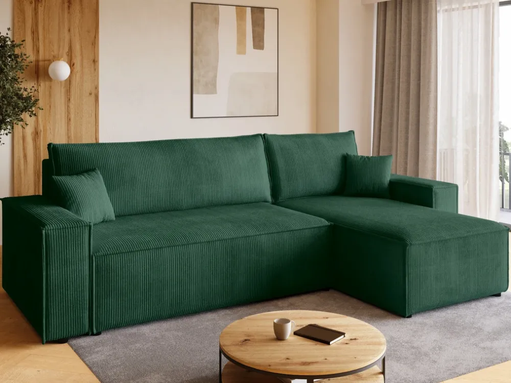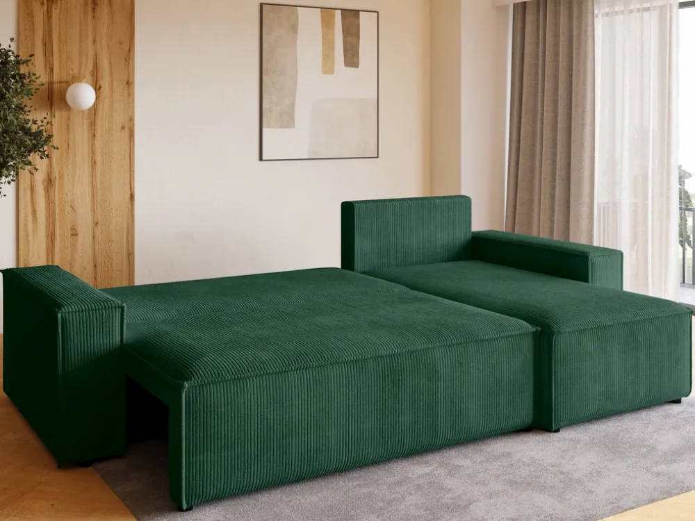 Zaprojektowany z myślą o codziennym komforcie i funkcjonalności, ten narożnik stanie się ulubionym miejscem wypoczynku w Twoim salonie. Siedzisko oparte na sprężynach falistych i piance PUR zapewnia idealne podparcie, a miękka sztruksowa tkanina otula ciało przyjemną fakturą. Dzięki funkcji spania i pojemnikowi na pościel zyskujesz nie tylko wygodne łóżko, ale i dodatkowe miejsce do przechowywania.