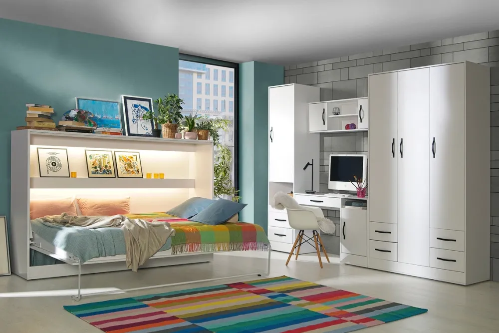 Dzięki poziomej konstrukcji mebel zajmuje mniej miejsca na wysokość, co czyni go idealnym rozwiązaniem do pomieszczeń z niskim sufitem lub tam, gdzie przestrzeń jest ograniczona. Wystarczy jeden ruch, by zamienić go w wygodne łóżko – łatwo, szybko i bez wysiłku.