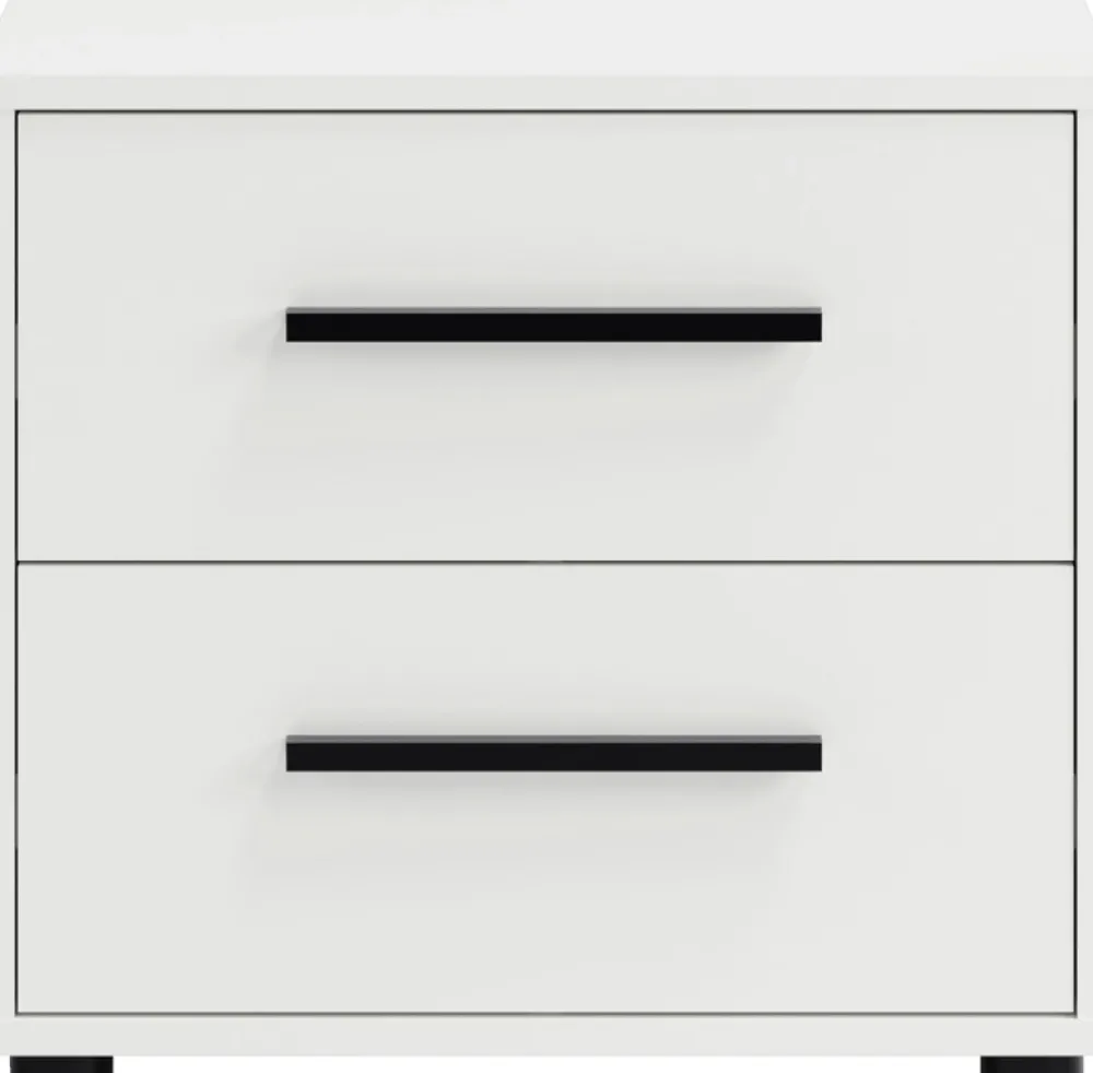 - Stolik nocny MAXIDO z 2 pojemnymi szufladami na kulkowych prowadnicach to funkcjonalny i nowoczesny mebel. Biały korpus, czarne uchwyty, obrzeża ABS i stabilne nogi z tworzywa. Kompaktowy design, idealny do nowoczesnych sypialni.
